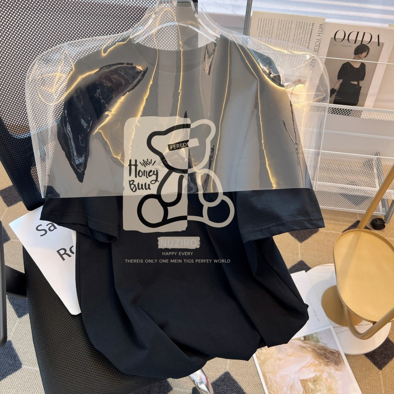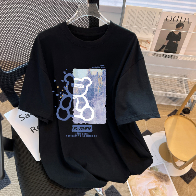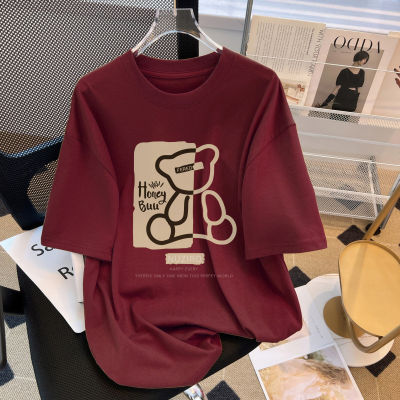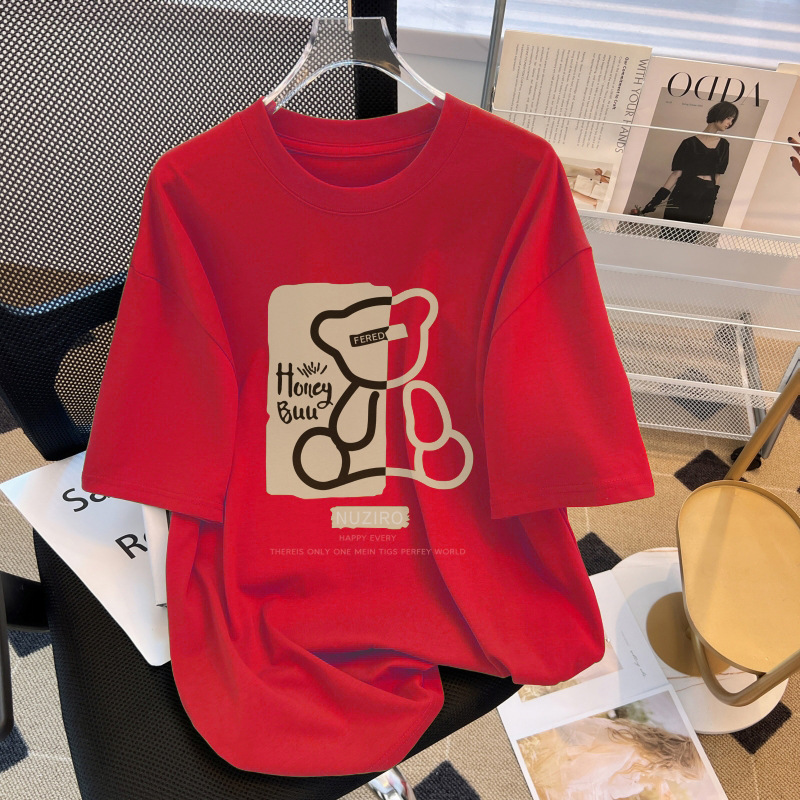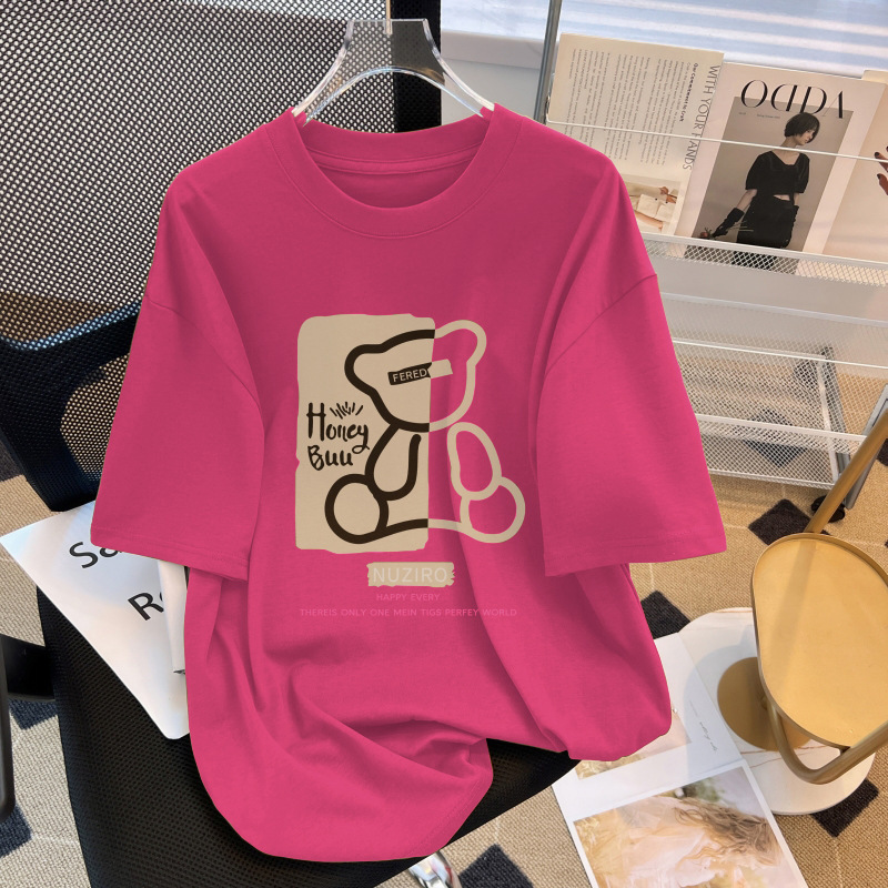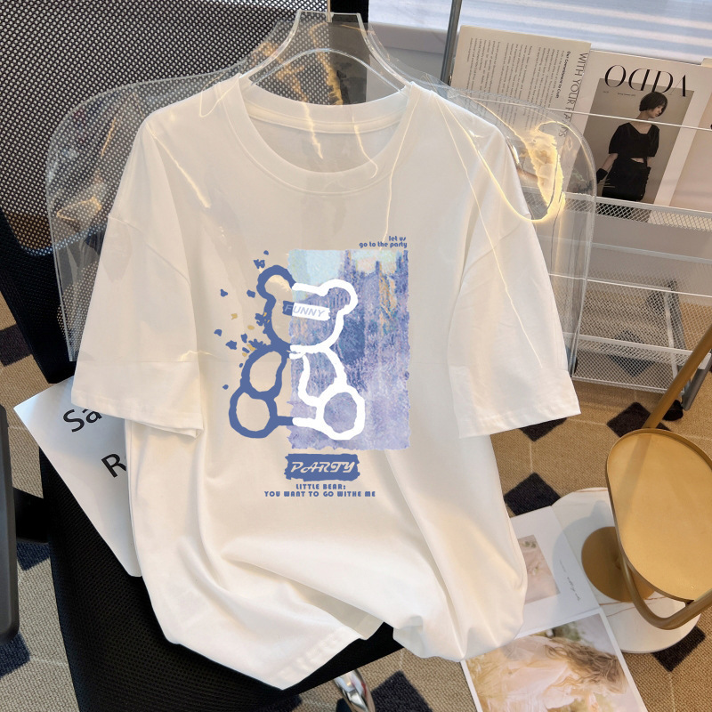 맞춤형 여성용 광고 티셔츠 여름 신상품 곰 프린트 순면 티셔츠 여성용 라운드넥 다용도 탑 반팔 의류