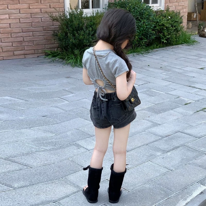여자 기질 정장 여름 새로운 슬림 짧은 Drawstring Backless 반팔 티셔츠 데님 반바지 투피스 세트스토어 가기