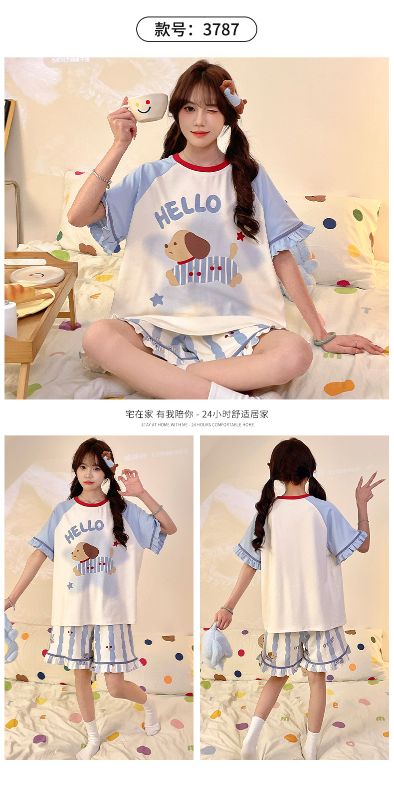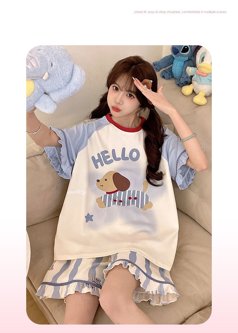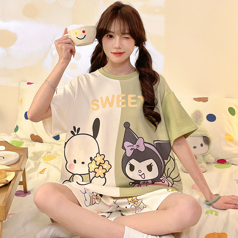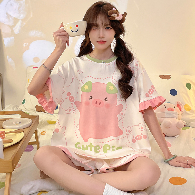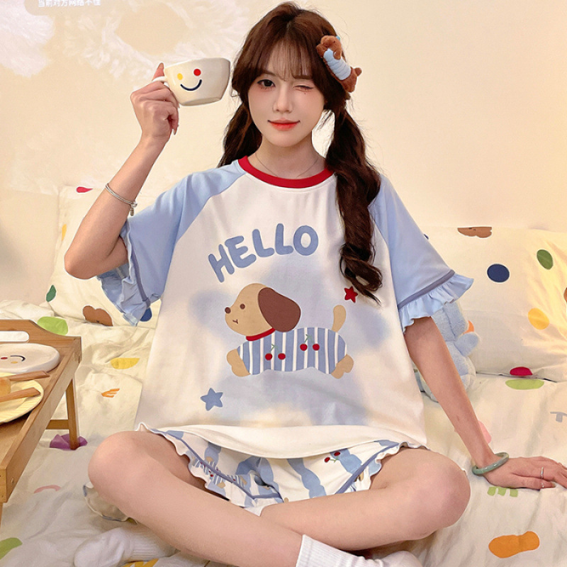 여름 만화 소녀 달콤한 잠옷 반팔 반바지 순수 코튼 소녀 플러스 사이즈 여성 인터넷 연예인 홈웨어 세트