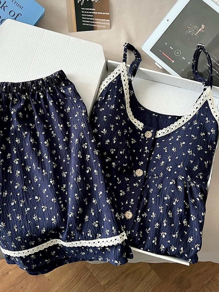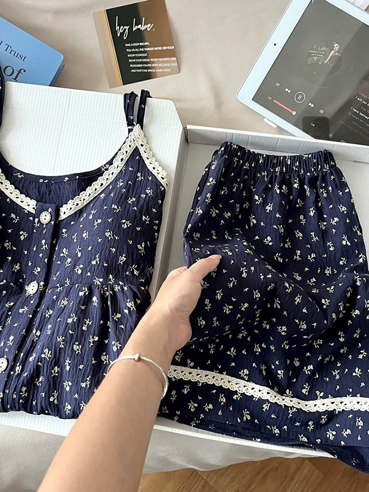 여름 새 스타일 조끼 반바지 잠옷 여성용 Sweet Ins 격자 무늬 가슴 패드가있는 서스펜더 반바지 클라우드 코튼 홈웨어