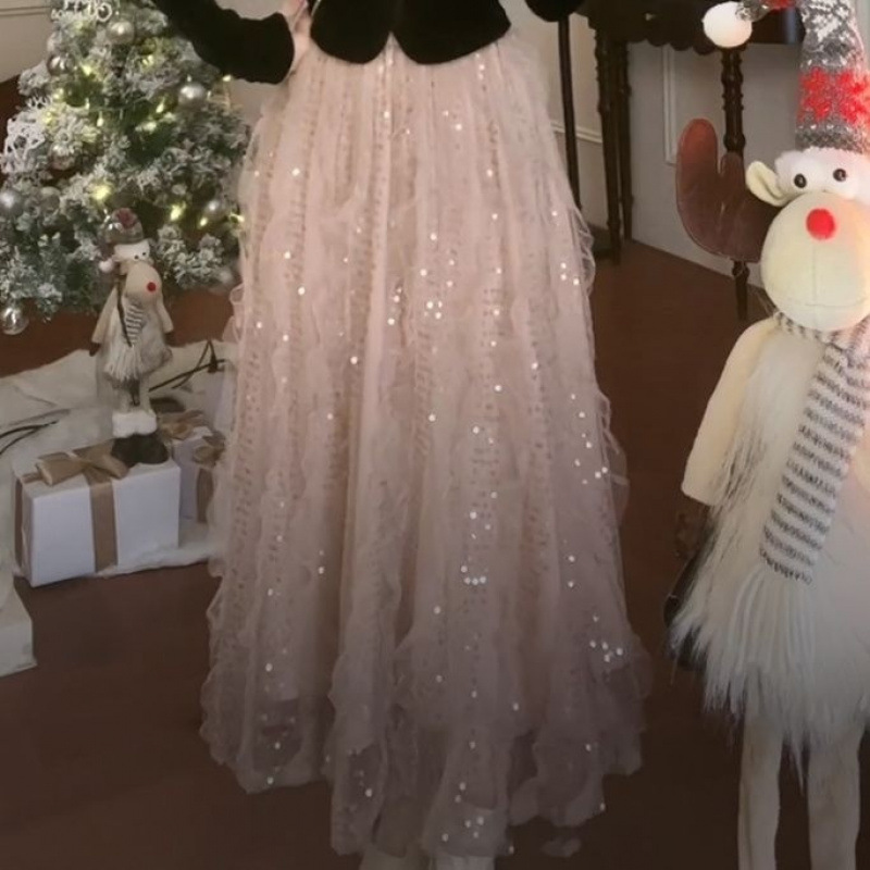 여성을 위한 인기 새해 의상, 프랑스 고급 인터넷 연예인 이너 슈트, 탑, 스팽글 스커트, 투피스 세트스토어 가기