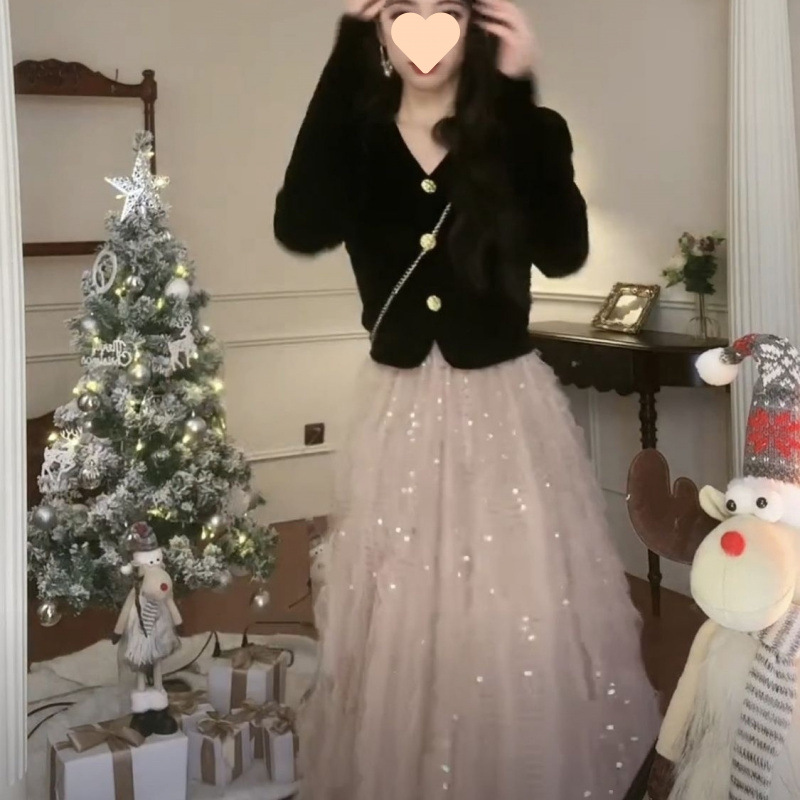 过年流行穿搭一整套女法式高档网红内搭套装上衣亮片半身裙两件套