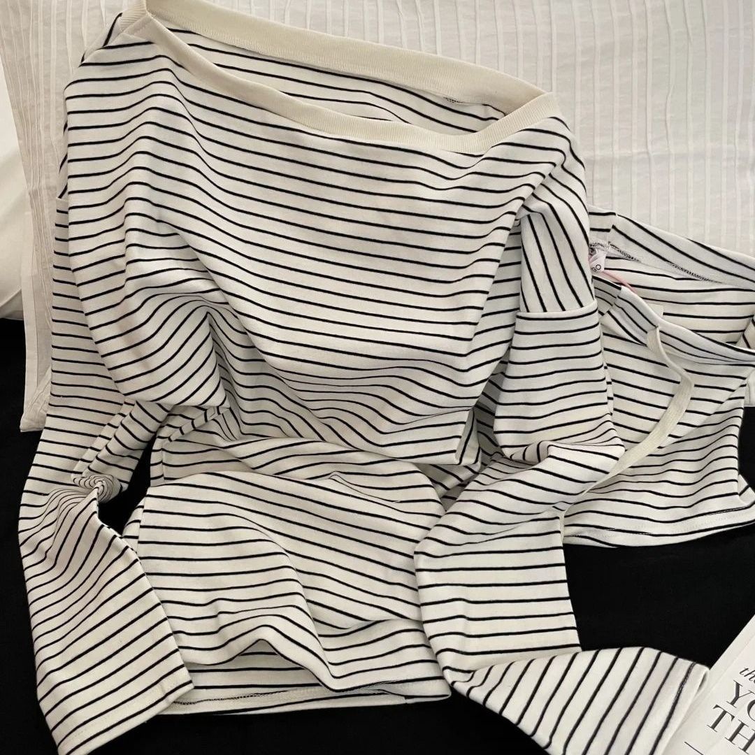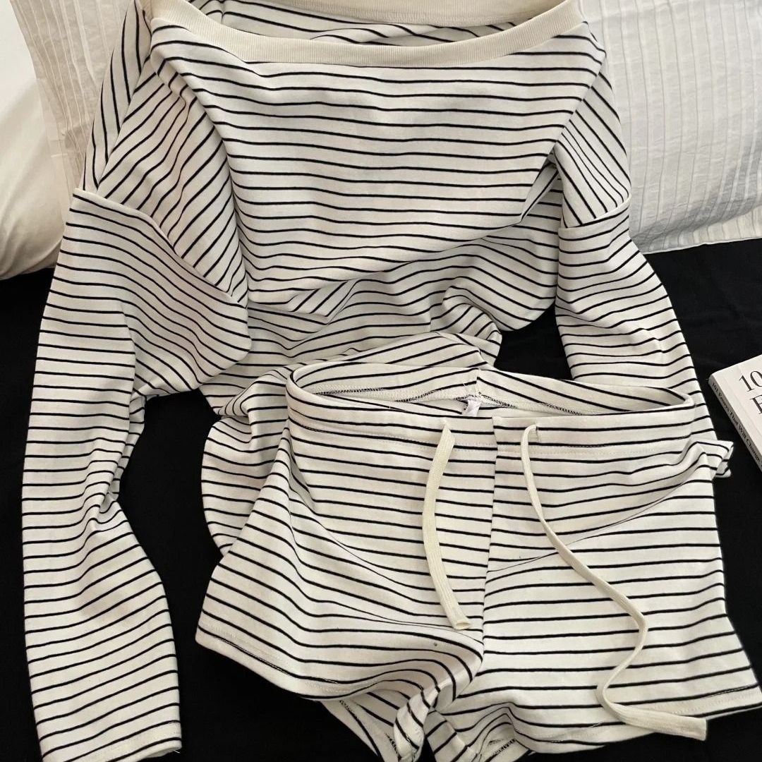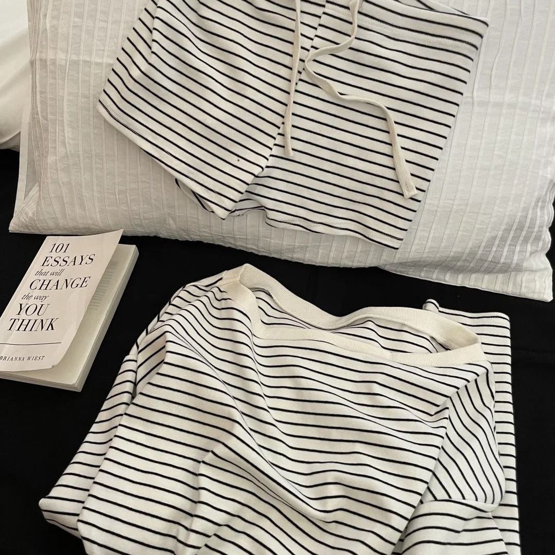 여성을위한 흑백 줄무늬 비스듬한 어깨 달콤한 긴팔 잠옷 여름 2025 새로운 봄, 가을 반바지 홈웨어 투피스 세트스토어 가기