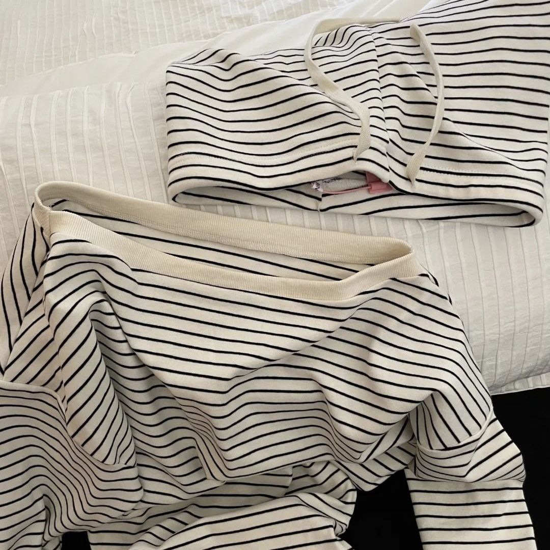 여성을위한 흑백 줄무늬 비스듬한 어깨 달콤한 긴팔 잠옷 여름 2025 새로운 봄, 가을 반바지 홈웨어 투피스 세트