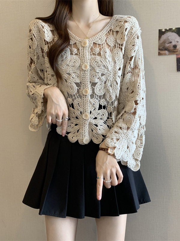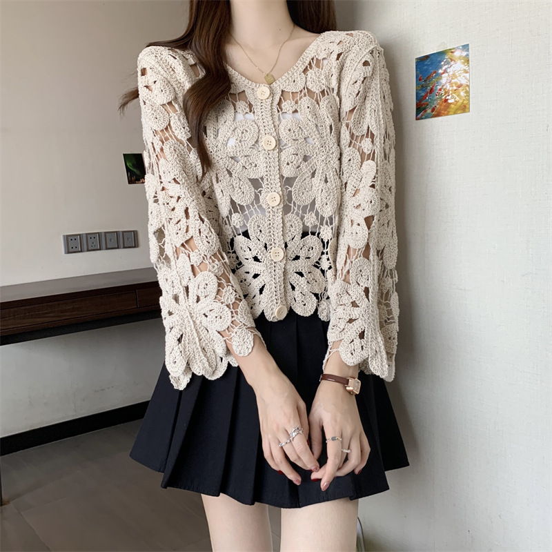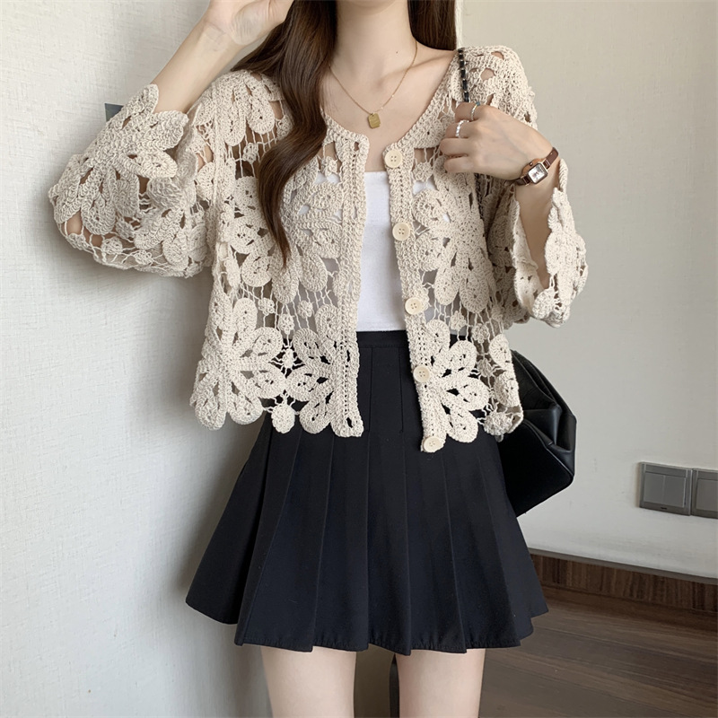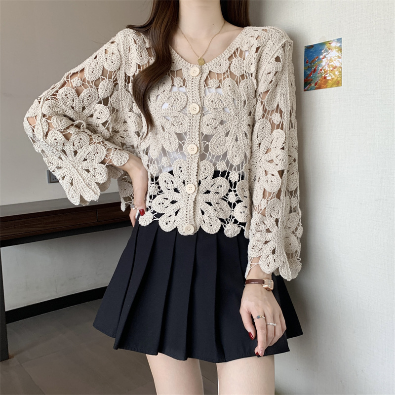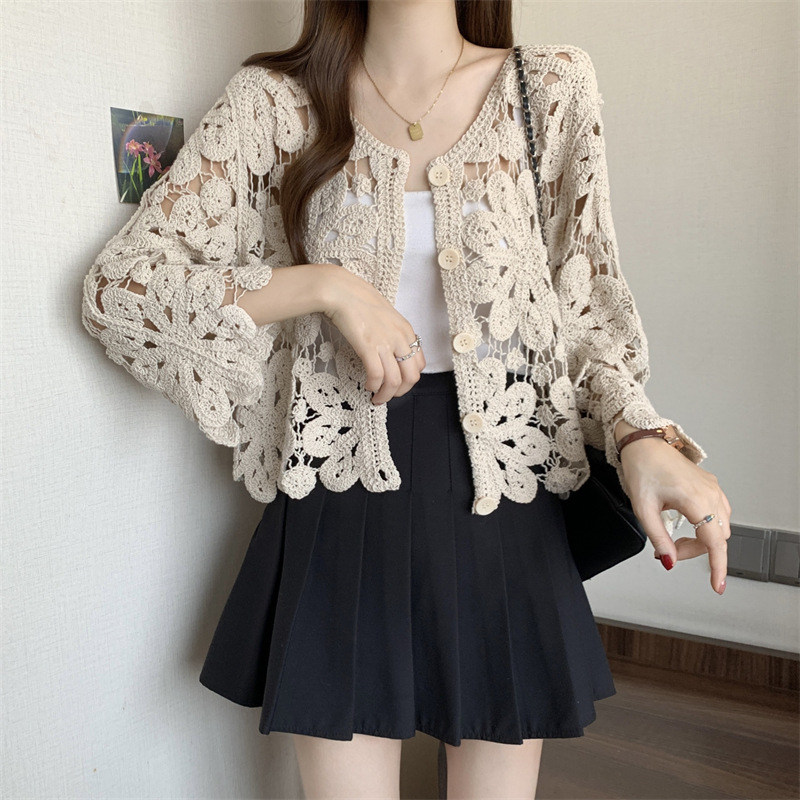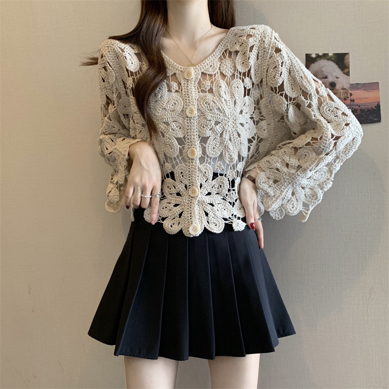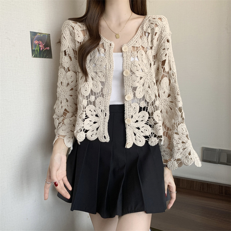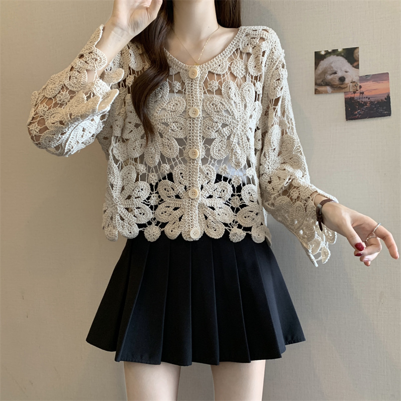여성을위한 프랑스 중공업 크로 셰 뜨개질 복고풍 라운드 넥 레이스 자수 중공 디자인 짧은 니트 카디건 탑 1062