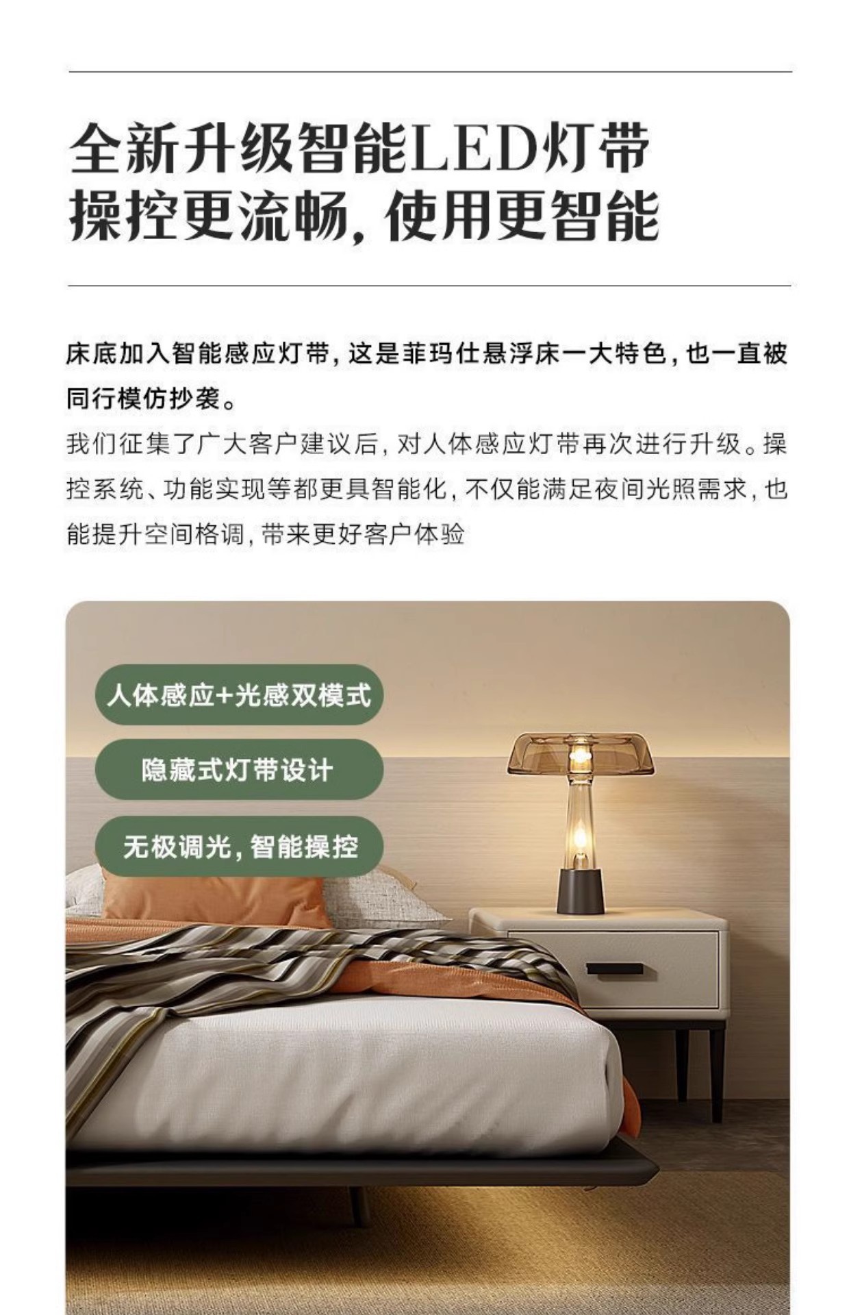 • 조명이 있는 침대 + 갈색 매트리스 + 캐비닛 2개