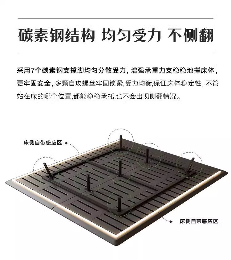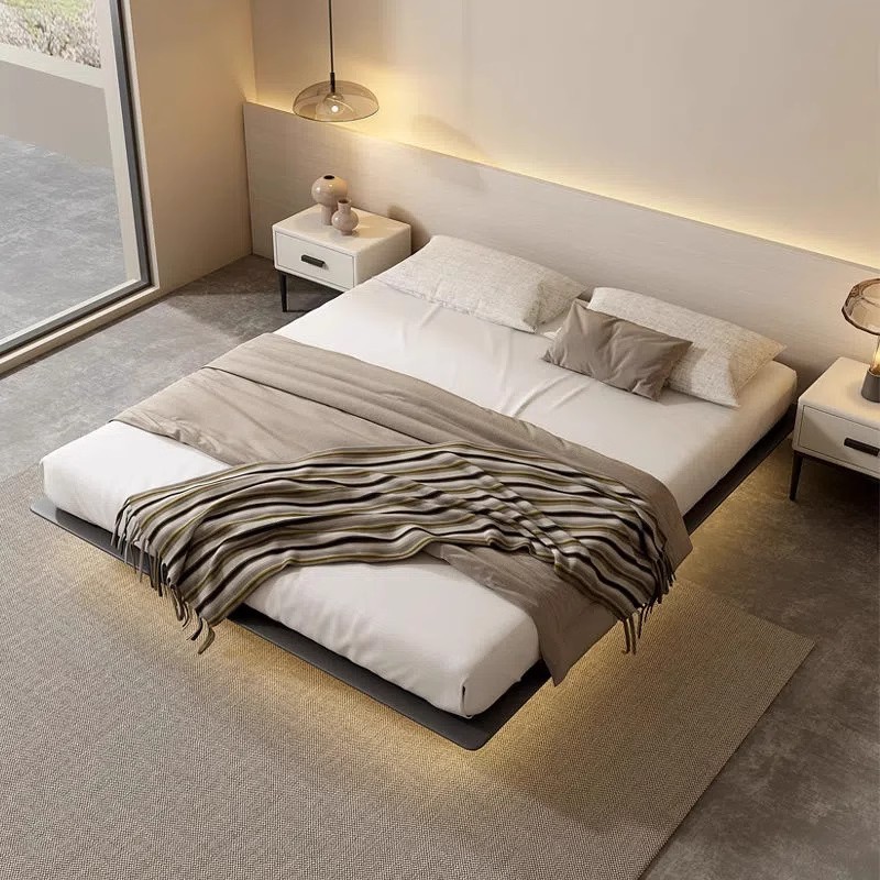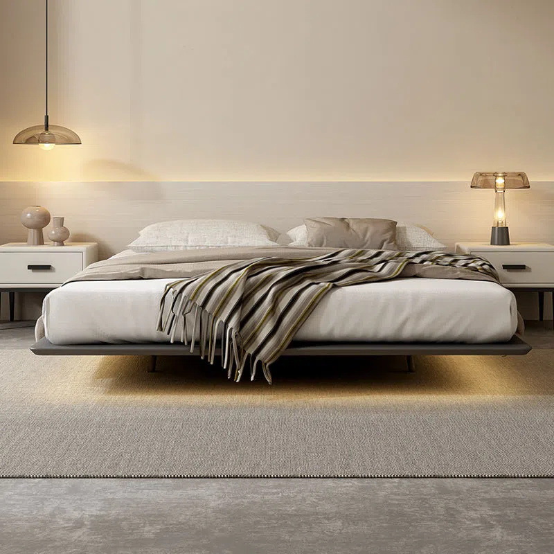 조명이 있는 미니멀리스트 공중 침대, 이탈리안 스타일, 침대 옆 없음, 등받이 없음, 원목, 인터넷 연예인 와비사비 스타일, 마스터 침실, 모던한 통나무 낮은 침대
