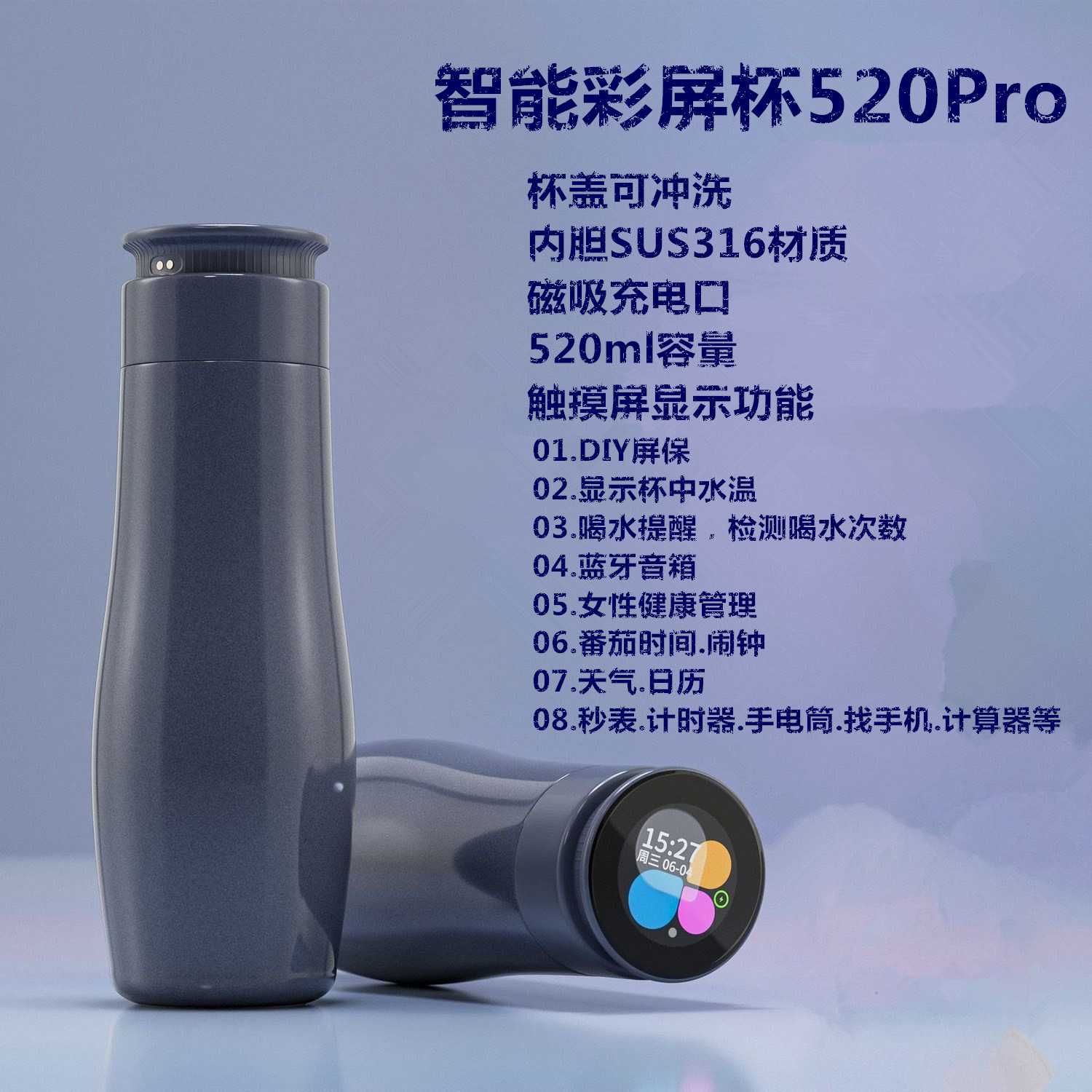 국경 간 AI 지능형 스크린 프로젝션 보온병 컵 화면 보호기 수온 식수 알림 블루투스 스피커 건강 관리 선물 비즈니스