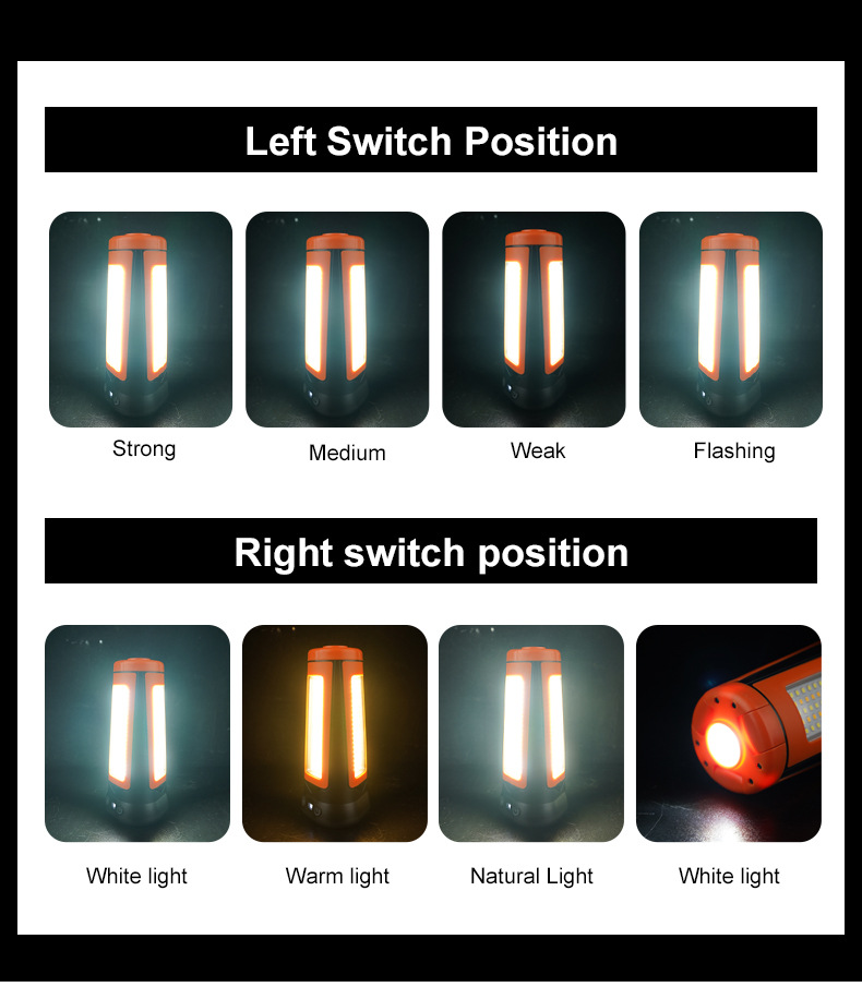 二:左开关,按第一次当前档位中亮,第二次低亮,第三次爆闪,第四次高亮,开始循环