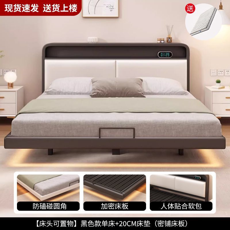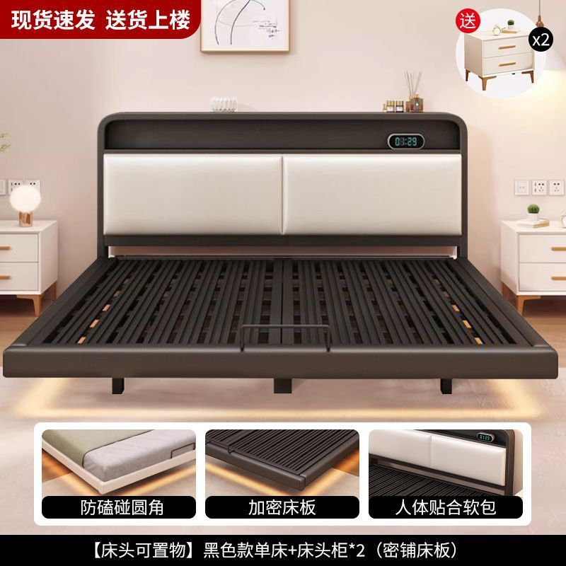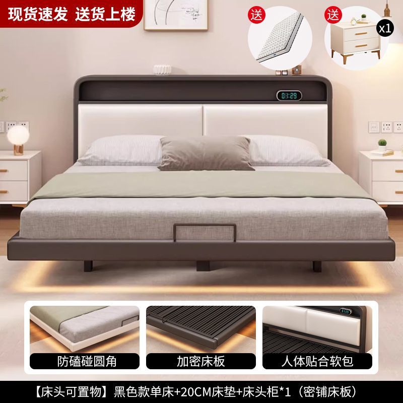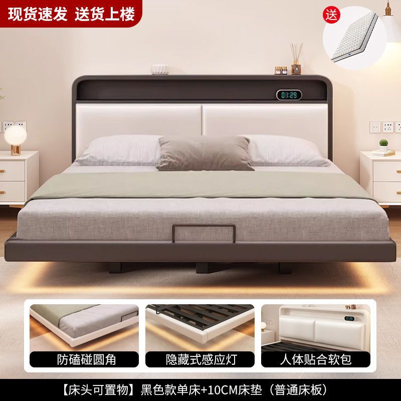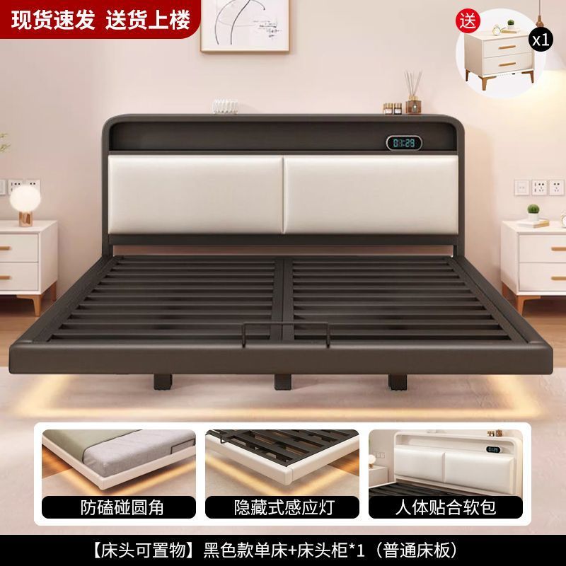 • 센서 조명이 장착된 밀도 높은 플랫 매달린 침대, 침대 옆 수납 공간, 검정색
