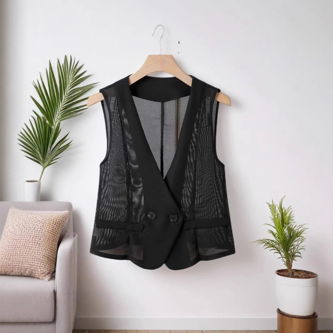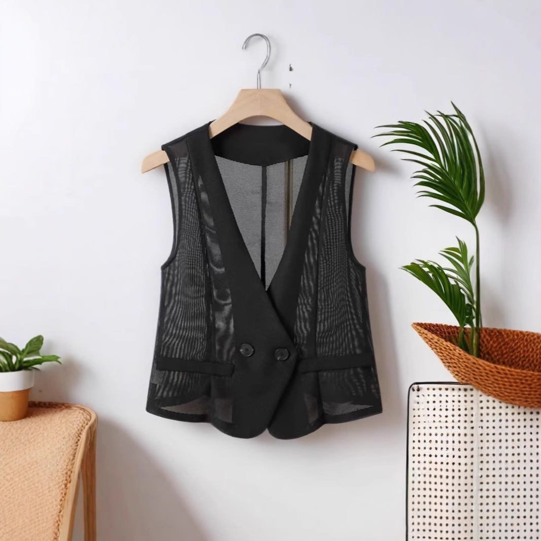 더블 버튼 여름 조끼 여성용 2025 신상 패션 디자인 슬림핏 숏 V넥 메쉬 조끼 아우터스토어 가기