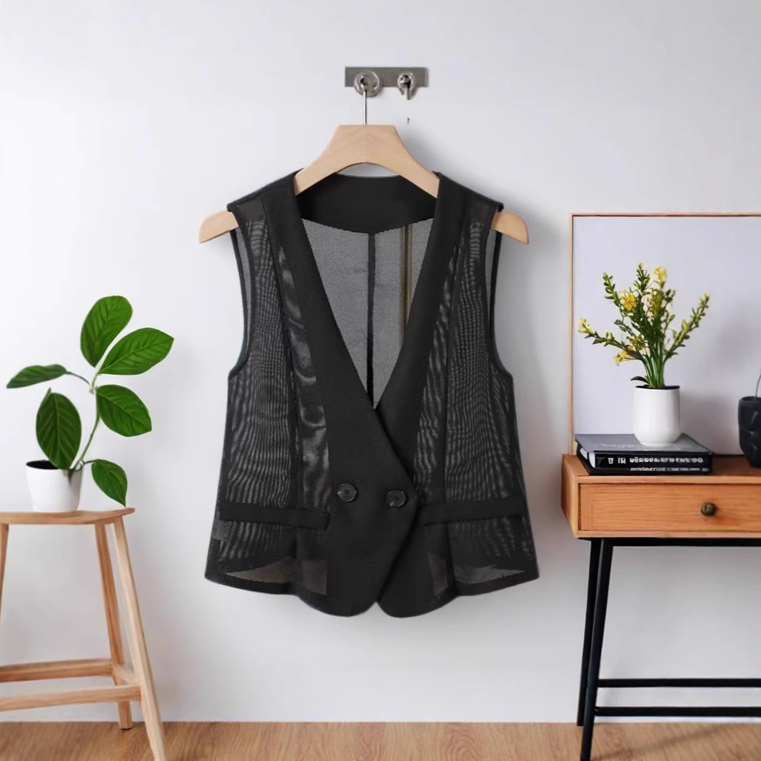 더블 버튼 여름 조끼 여성용 2025 신상 패션 디자인 슬림핏 숏 V넥 메쉬 조끼 아우터