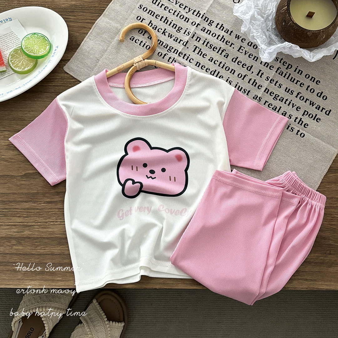 아동용 아이스 실크 반팔 소년 정장 가정복 소녀 여름 얇은 아기 잠옷 에어컨 의류 7부 바지스토어 가기
