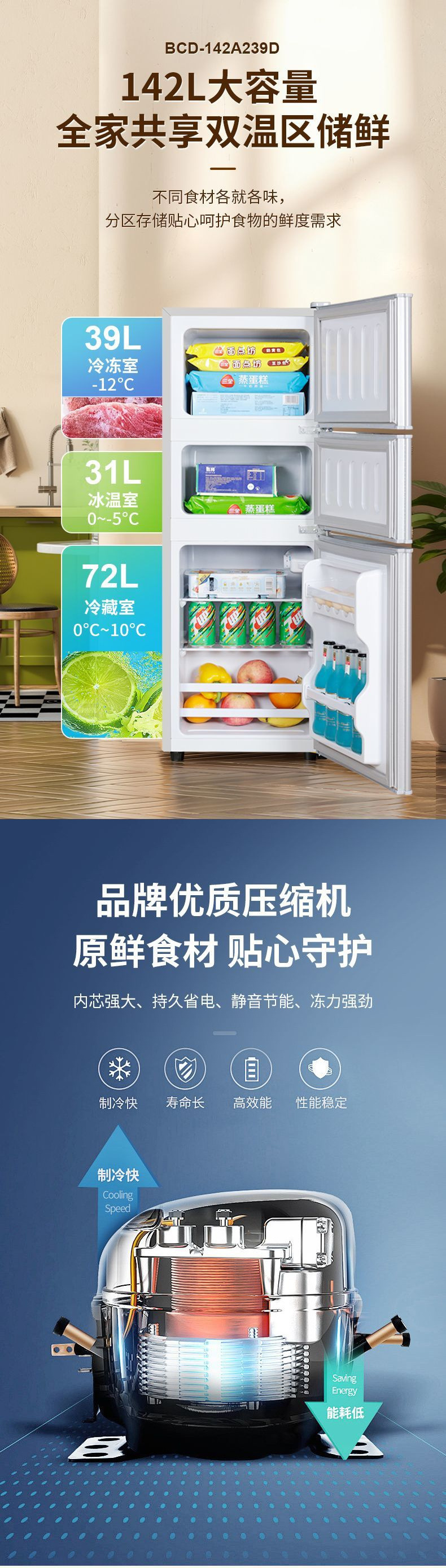 • AI96 이중 도어 + 상부 냉동고 및 하부 냉장고 + 조명.