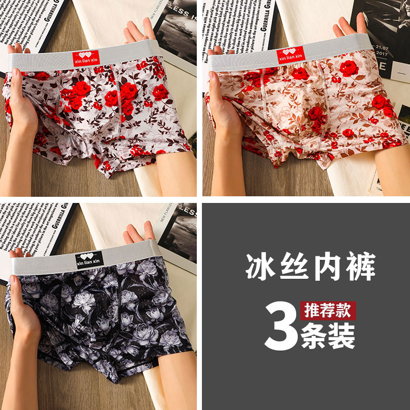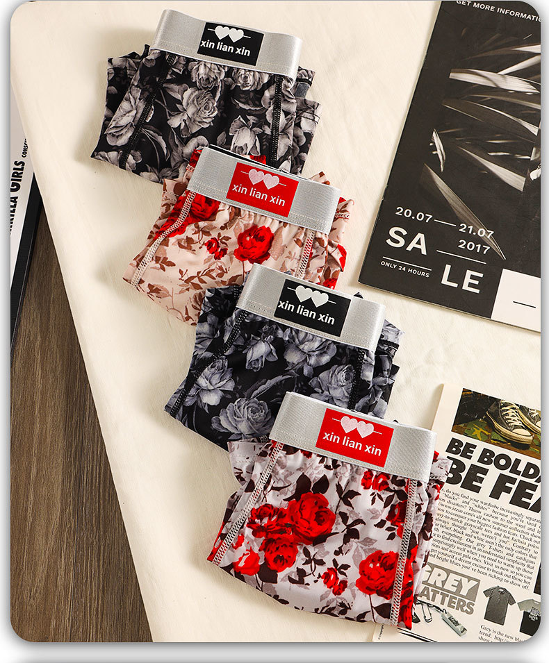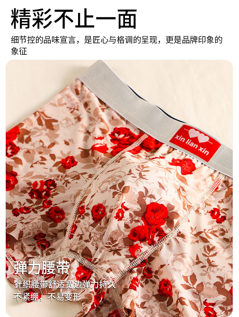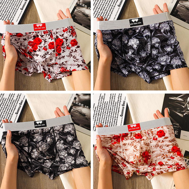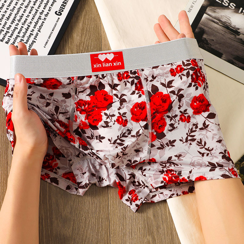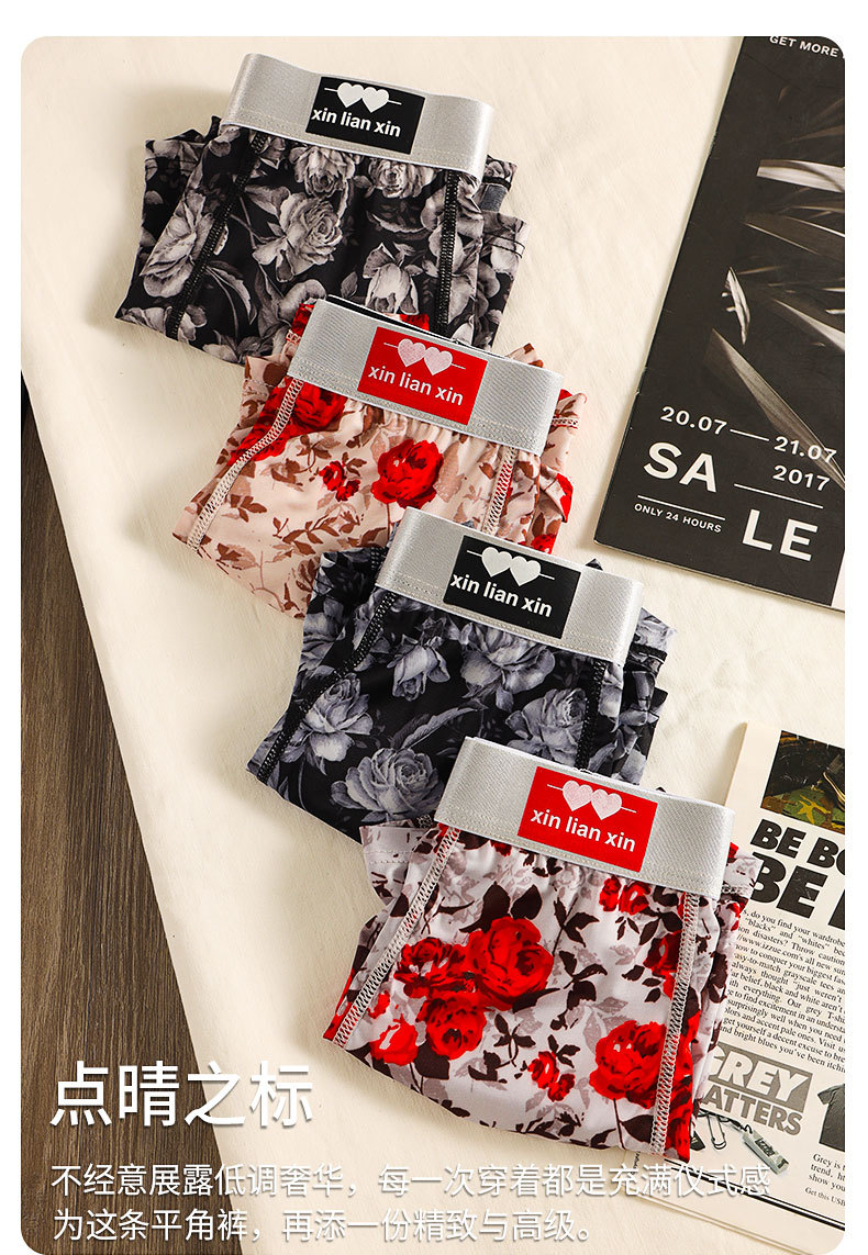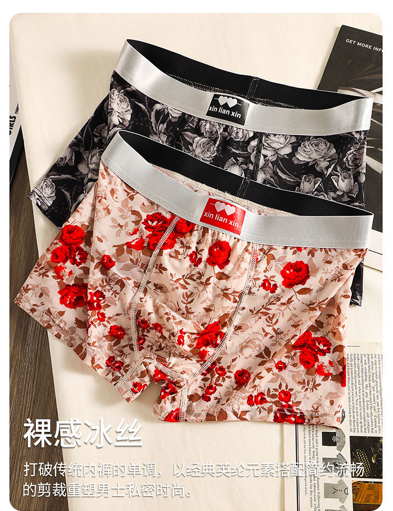 아이스 실크 남성 속옷 트렌디 로즈 프린트 부드럽고 편안하며 패셔너블한 맞춤형 복서 팬티 남성용 중간 허리 복서 팬티스토어 가기