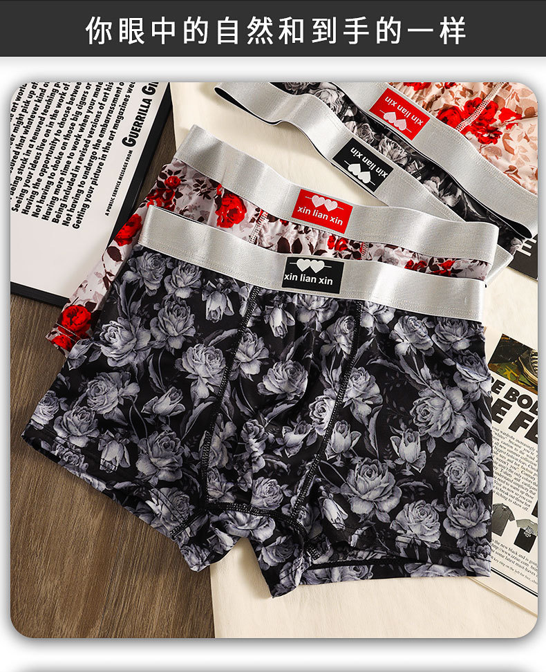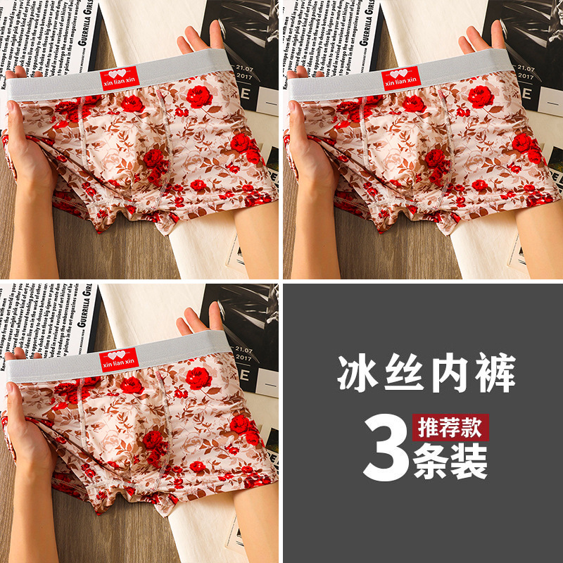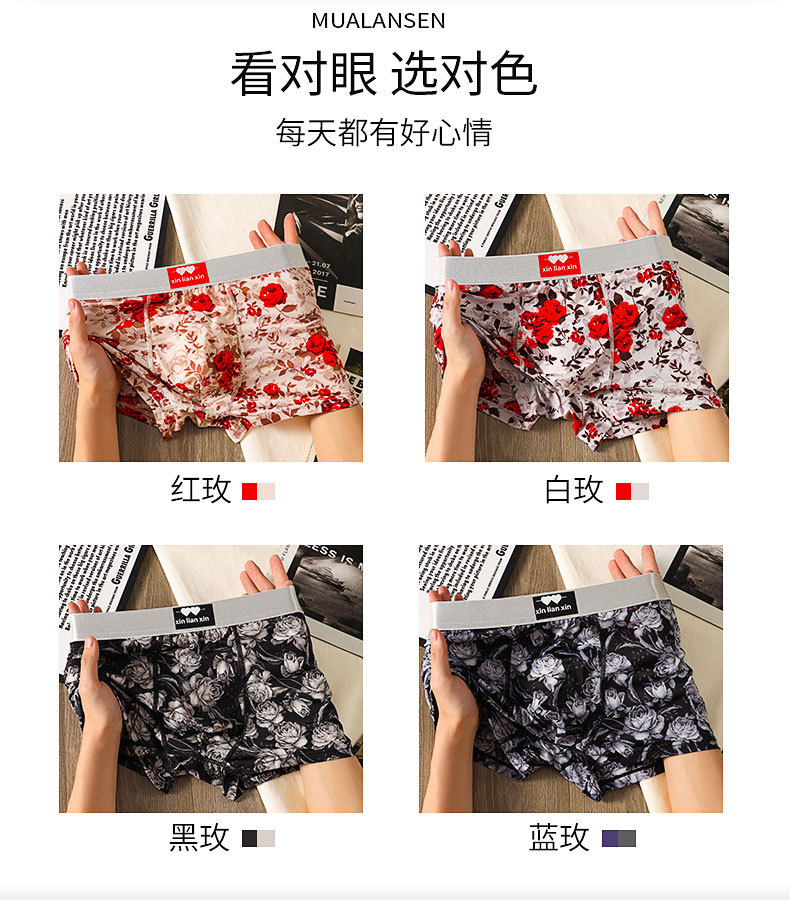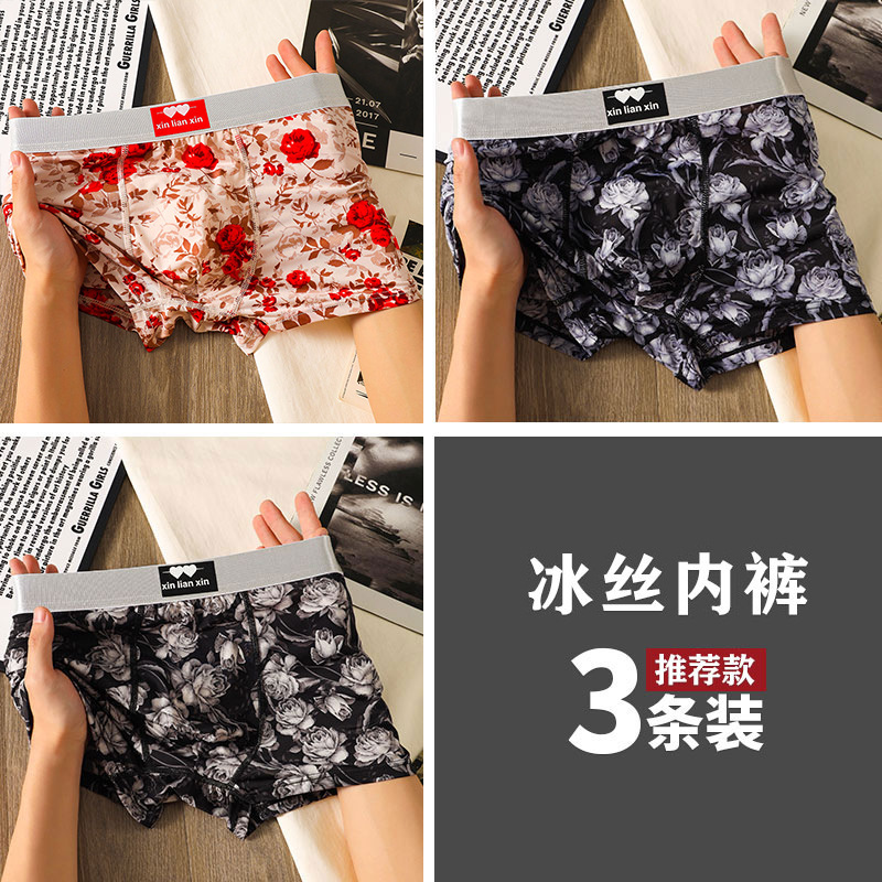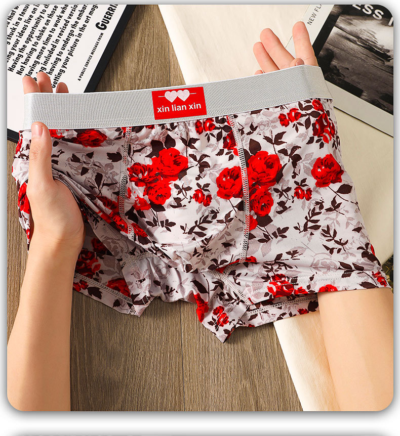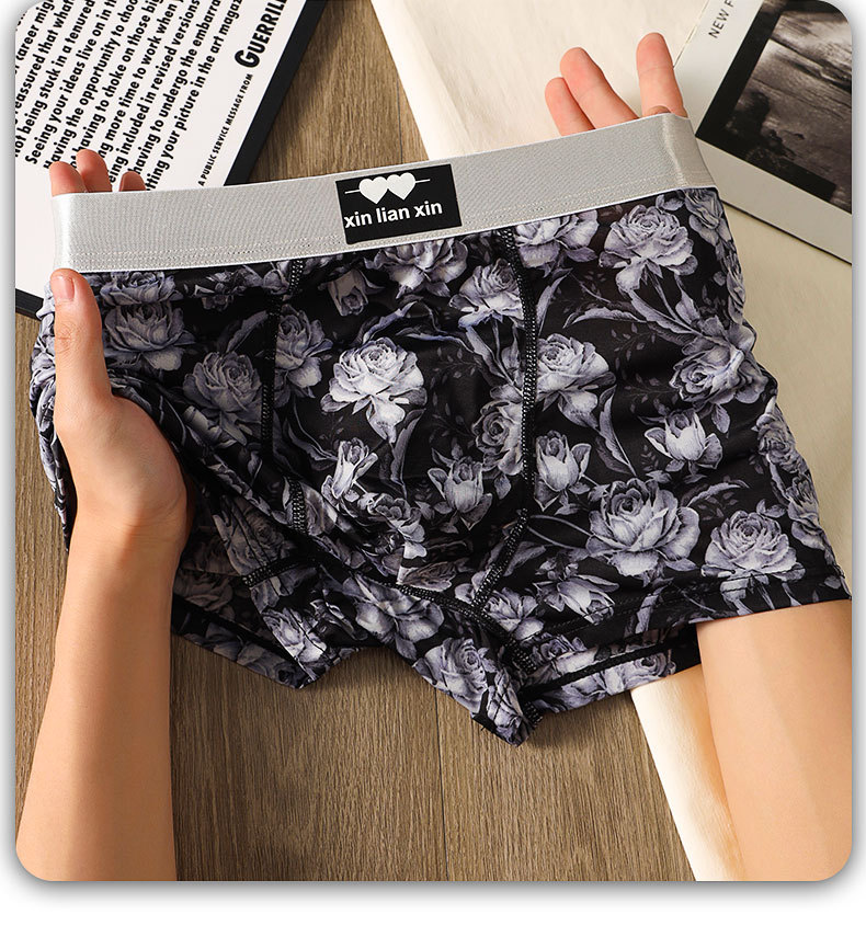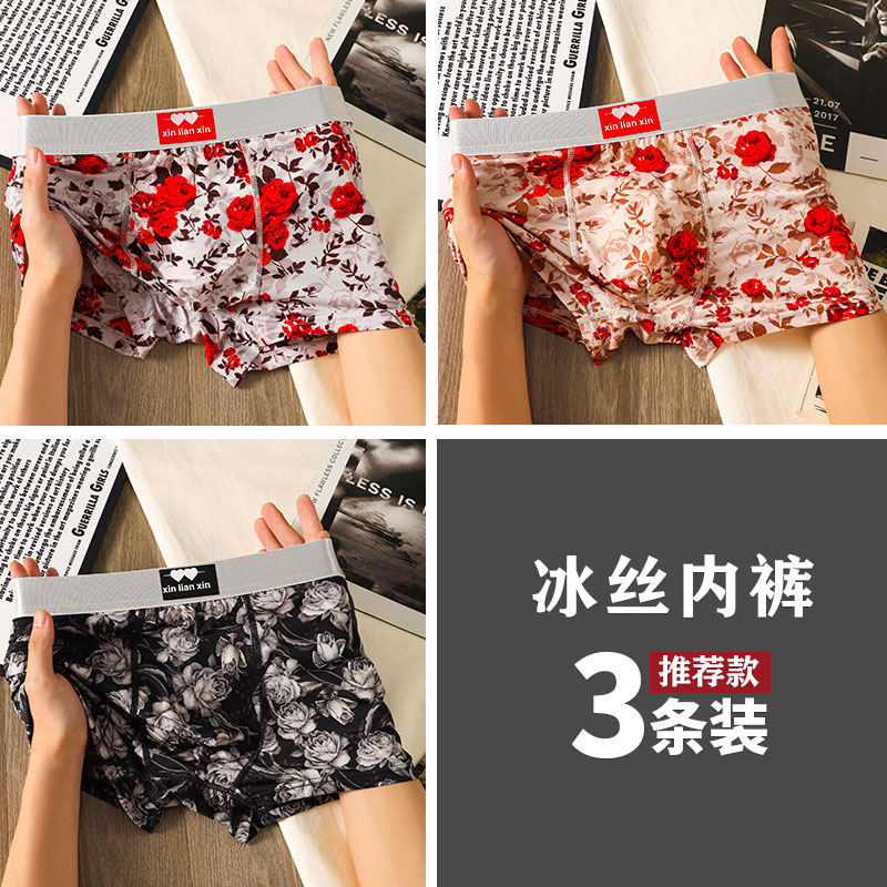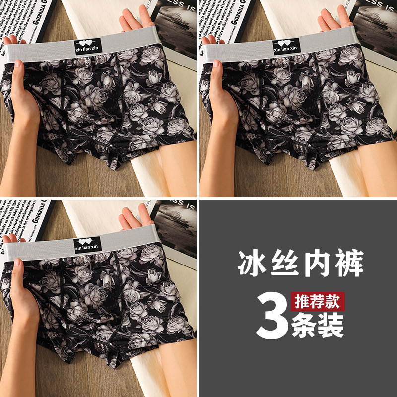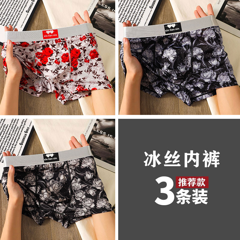 아이스 실크 남성 속옷 트렌디 로즈 프린트 부드럽고 편안하며 패셔너블한 맞춤형 복서 팬티 남성용 중간 허리 복서 팬티스토어 가기