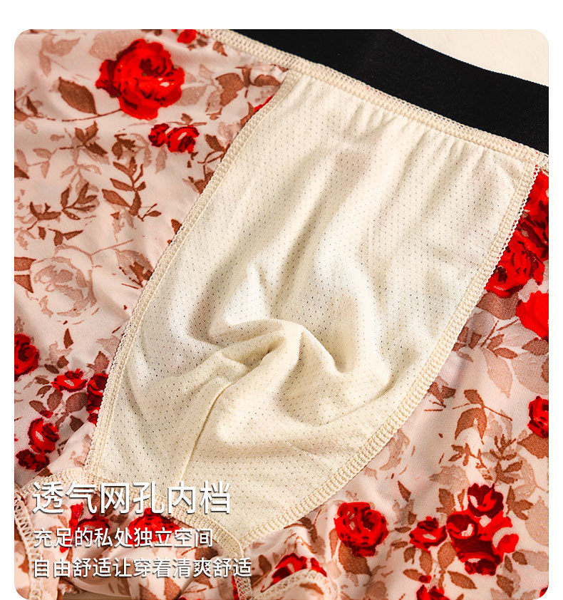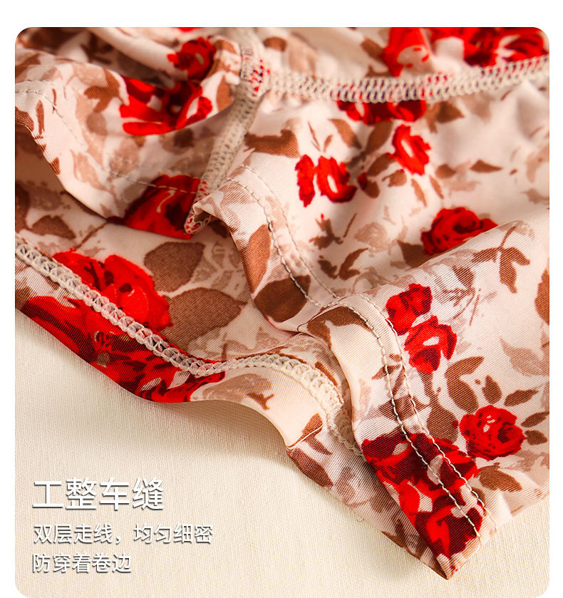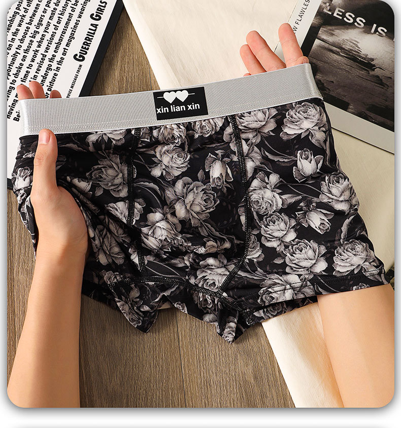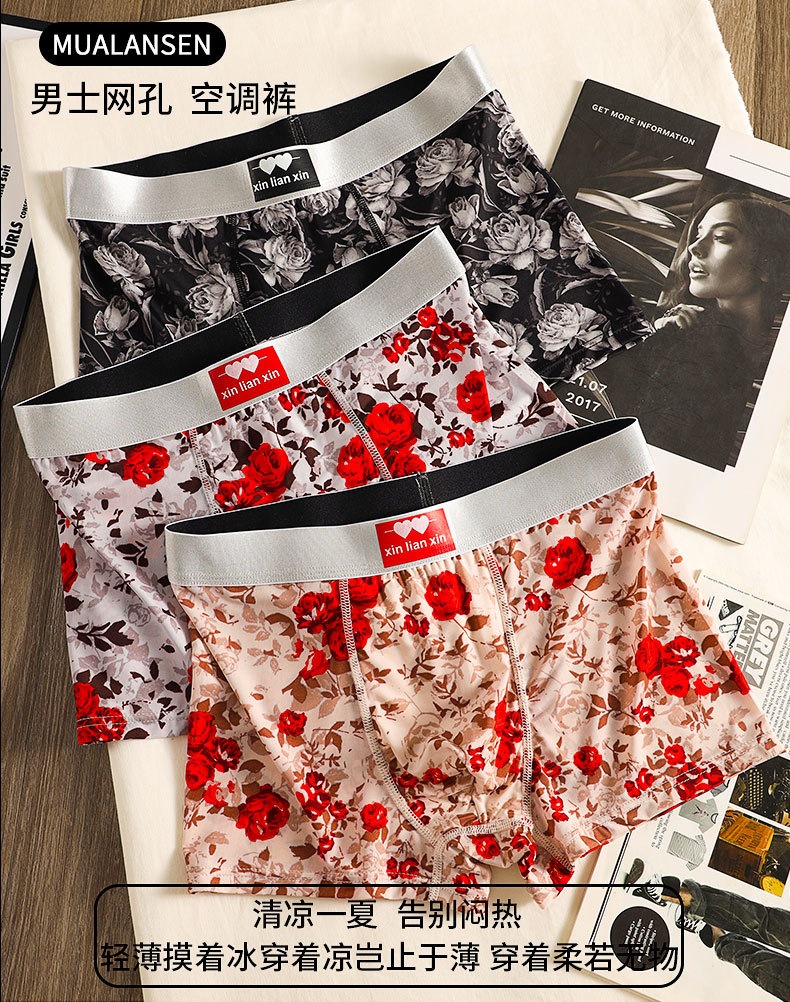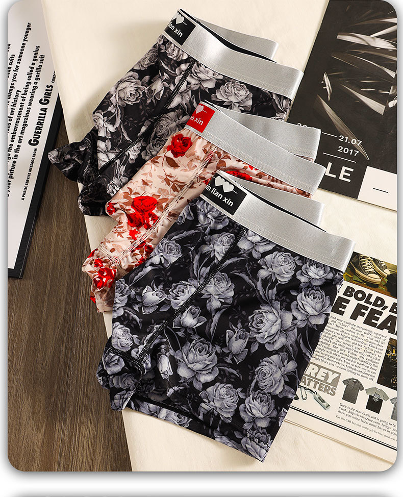 아이스 실크 남성 속옷 트렌디 로즈 프린트 부드럽고 편안하며 패셔너블한 맞춤형 복서 팬티 남성용 중간 허리 복서 팬티
