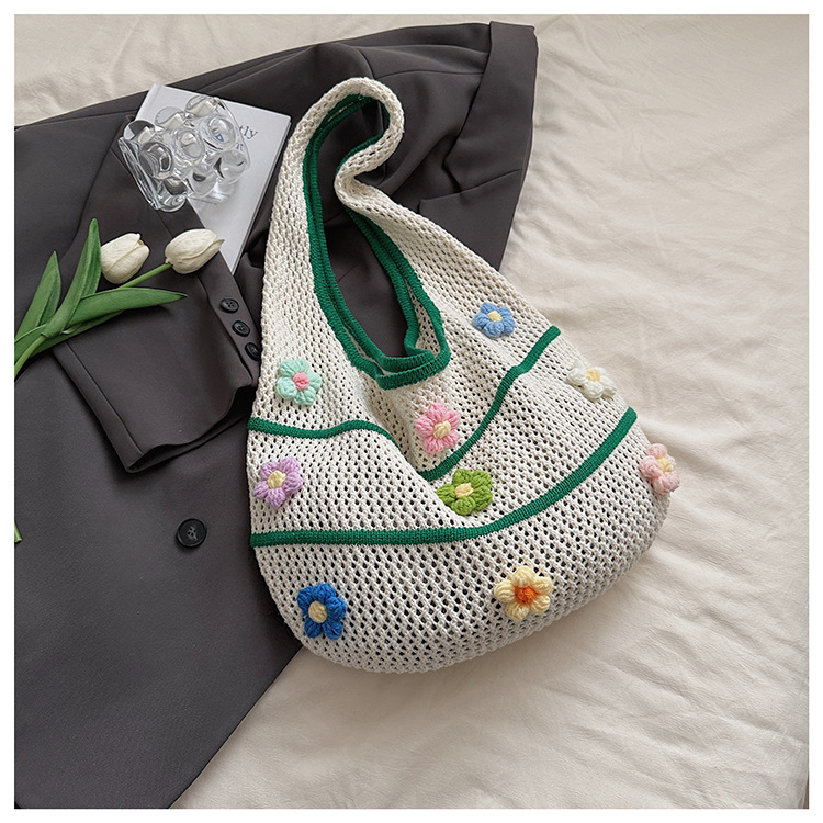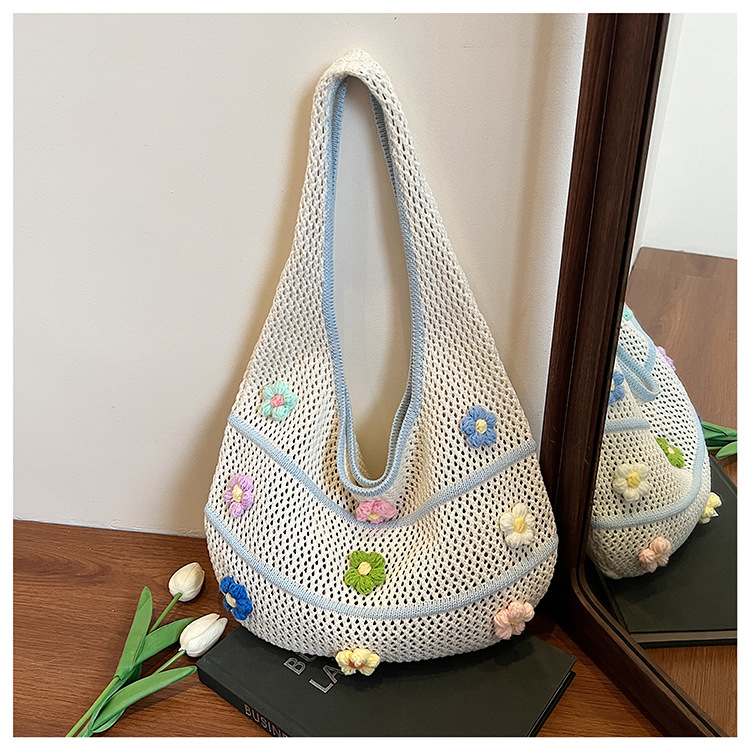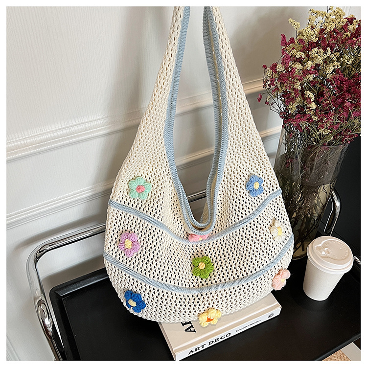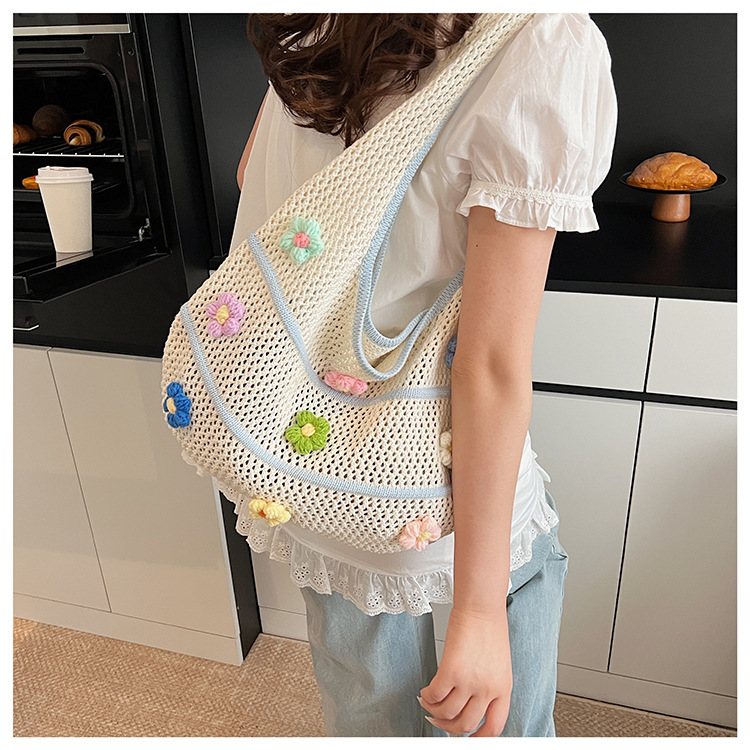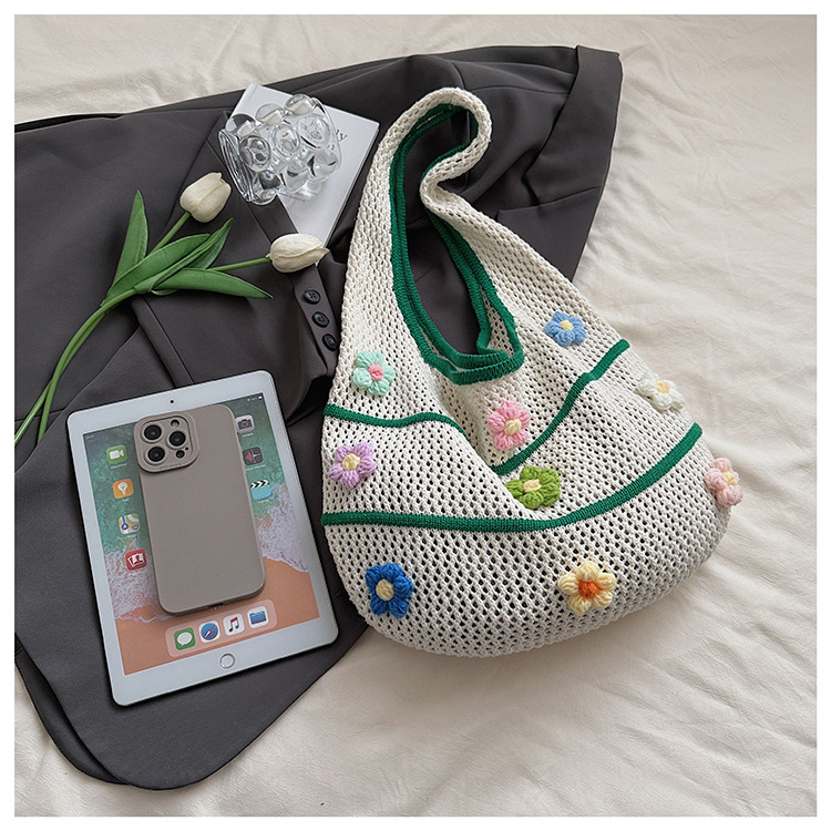 핸드메이드 울 크로셰 중공 원숄더 레이지 니트 백, 아름다운 꽃무늬, 뉴 비치 대용량 토트백스토어 가기