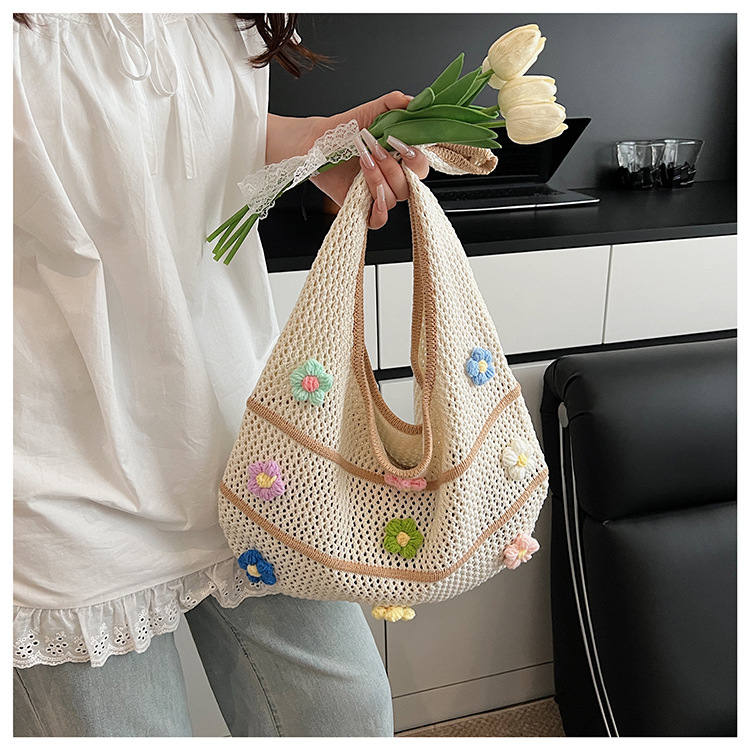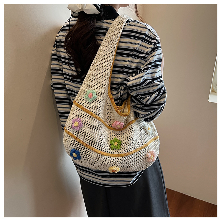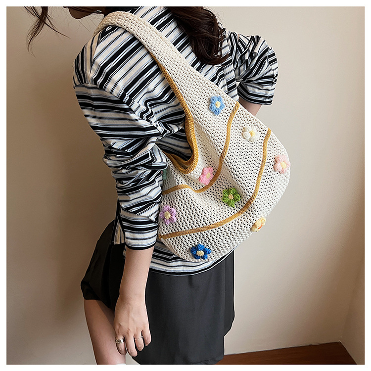 핸드메이드 울 크로셰 중공 원숄더 레이지 니트 백, 아름다운 꽃무늬, 뉴 비치 대용량 토트백