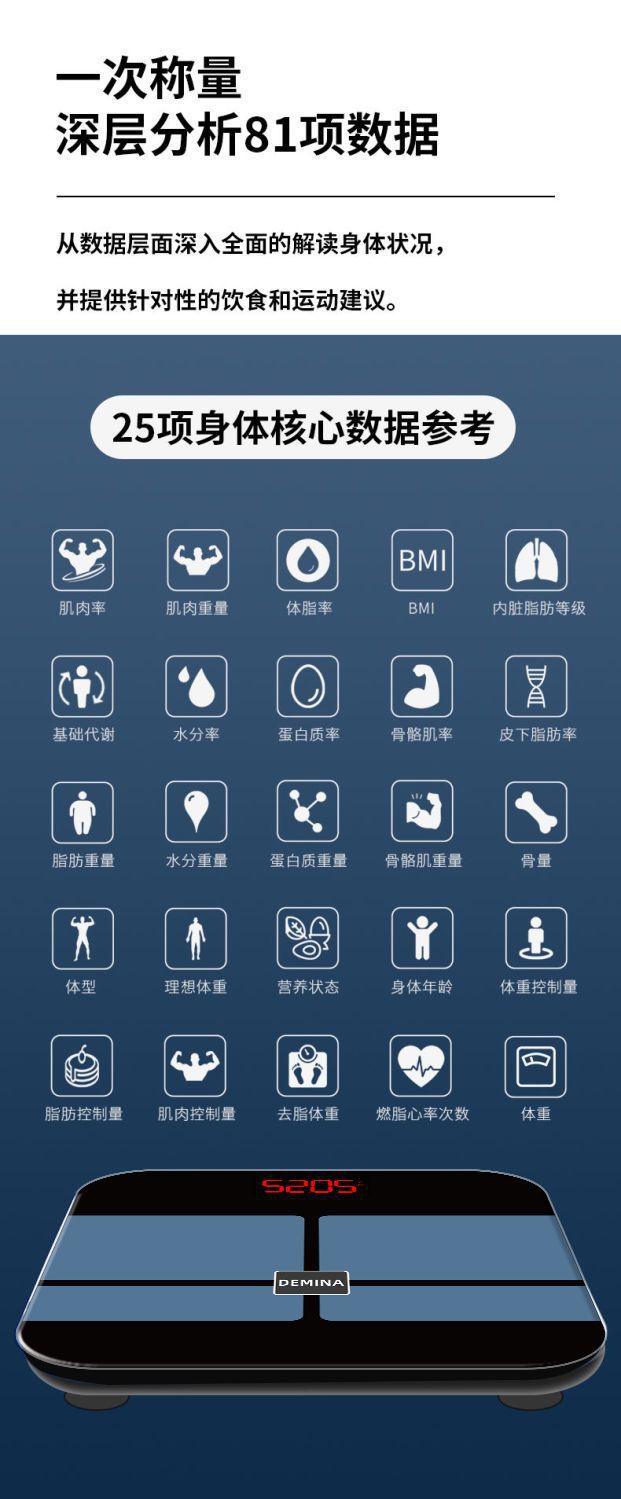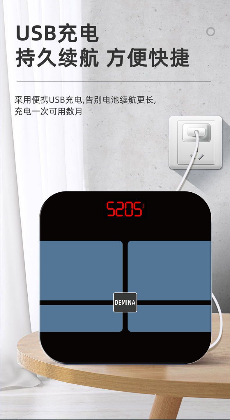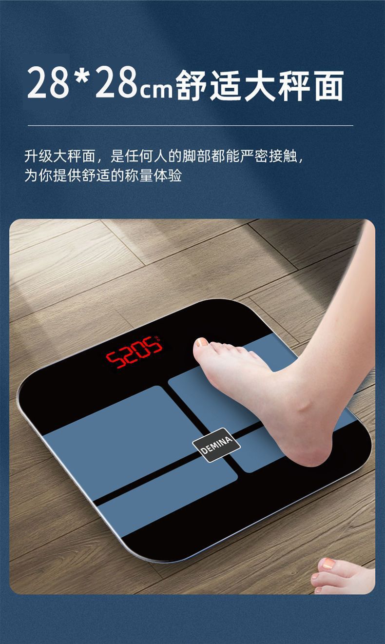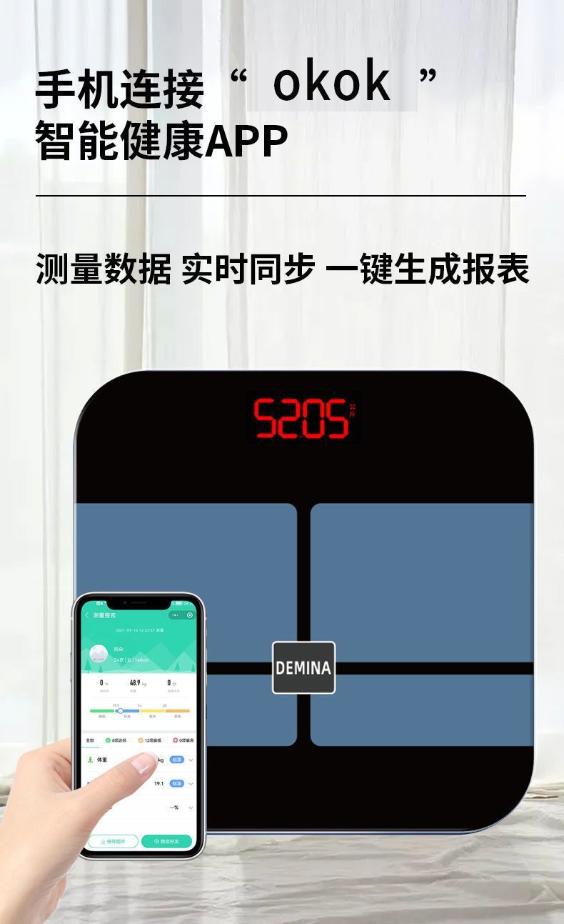 DEMINA 독일 체중계는 가정용으로 정확하며 체중 감량을 위한 두꺼운 전자 저울로 휴대폰에 연결할 수 있습니다. 체지방 측정기스토어 가기