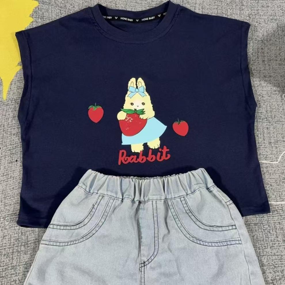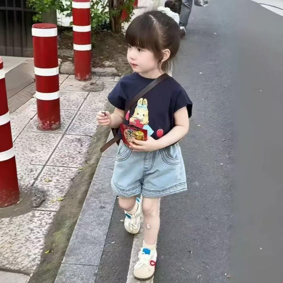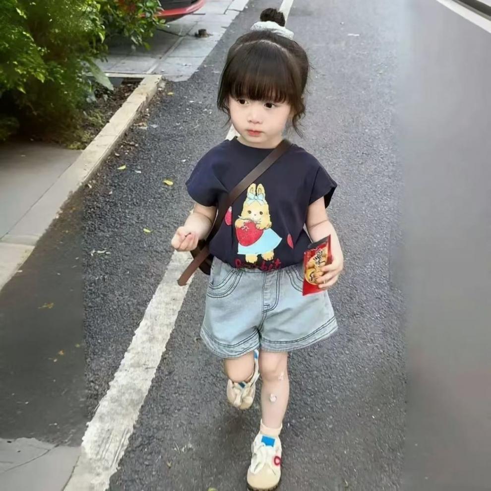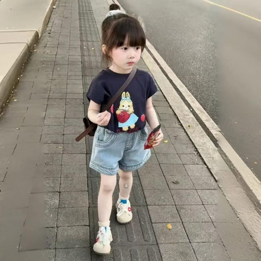 2025 여름 정장 소녀 한국 스타일 귀여운 만화 백리스 짧은 티셔츠 아기 소녀 다목적 솔리드 컬러 데님 반바지스토어 가기