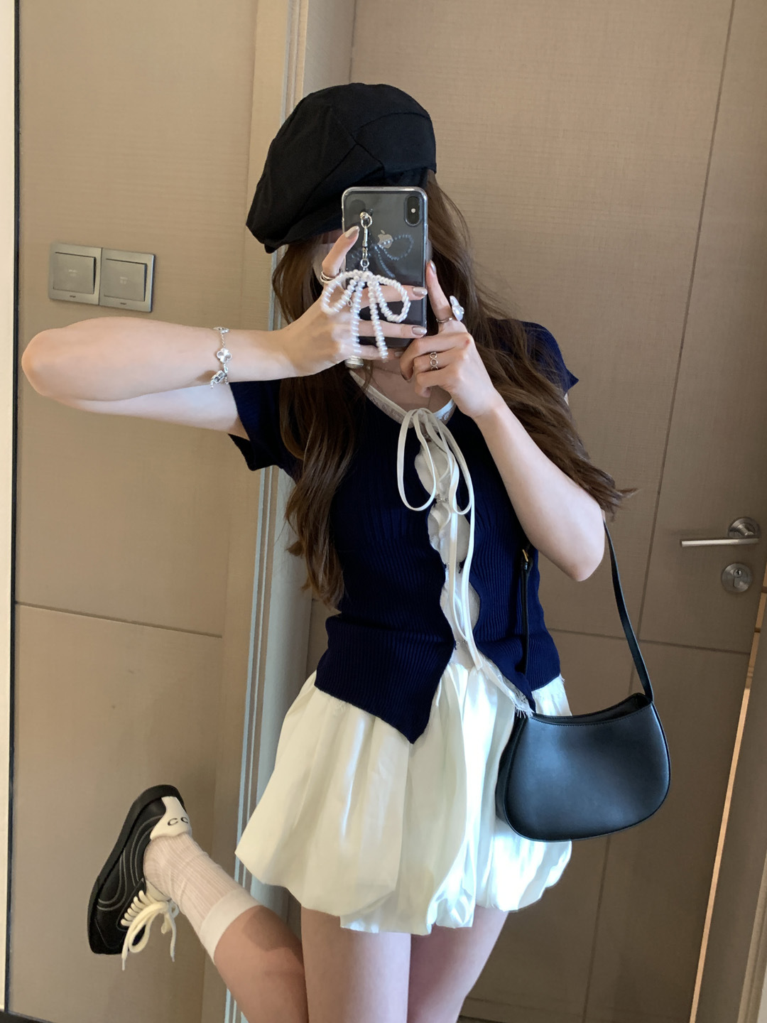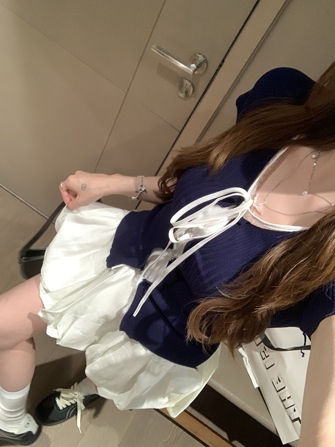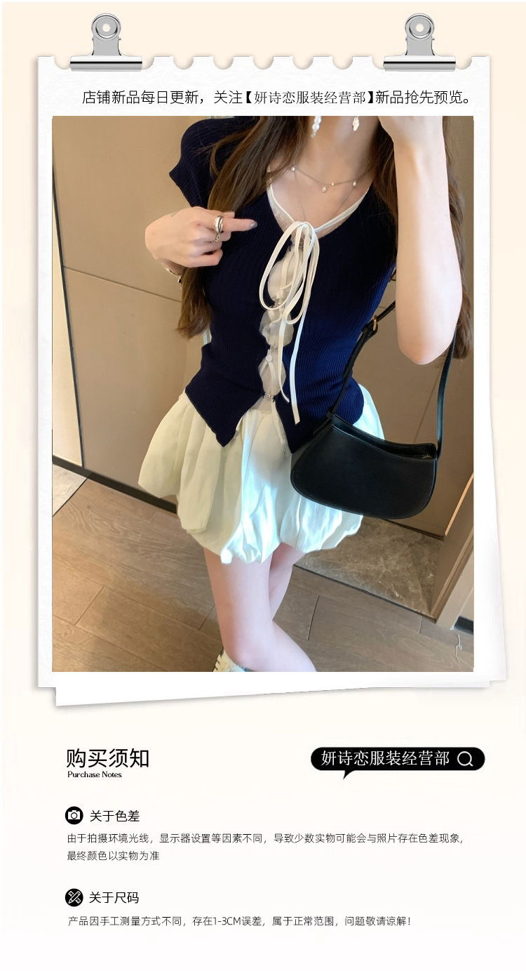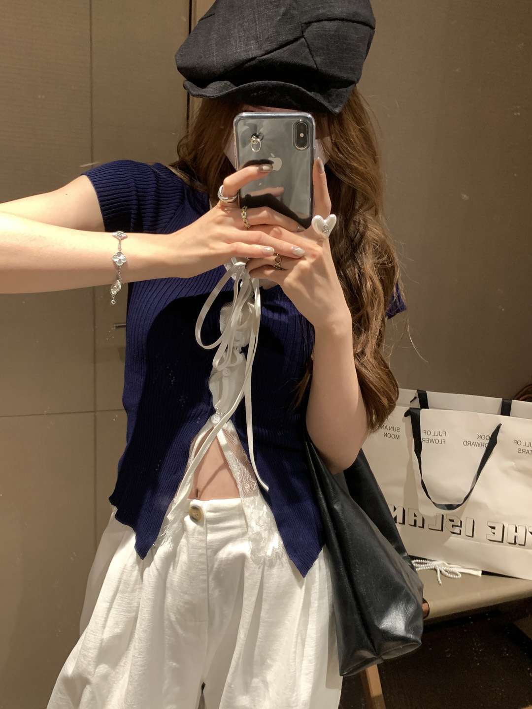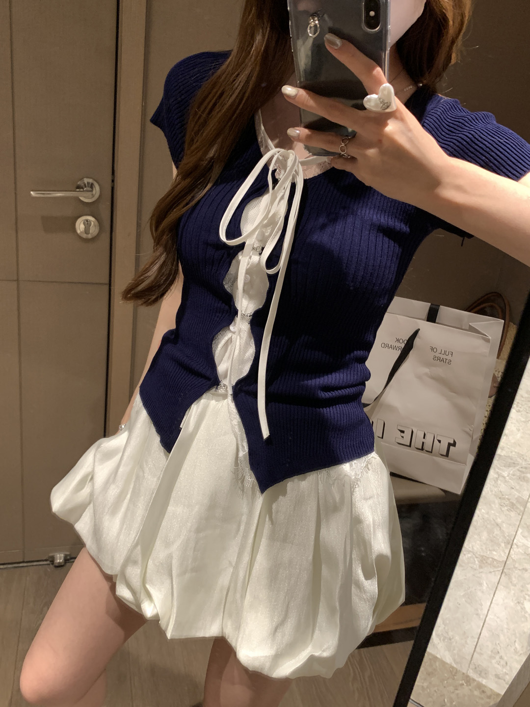 여성을위한 순수한 욕망 스타일 레이스 스플 라이스 레이스 업 반팔 스웨터 여름 새로운 섹시 할로우 가짜 투피스 오른쪽 어깨 탑스토어 가기