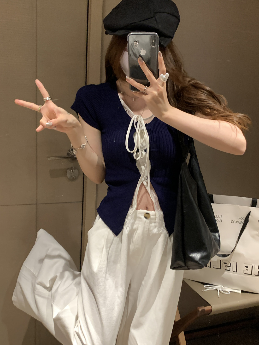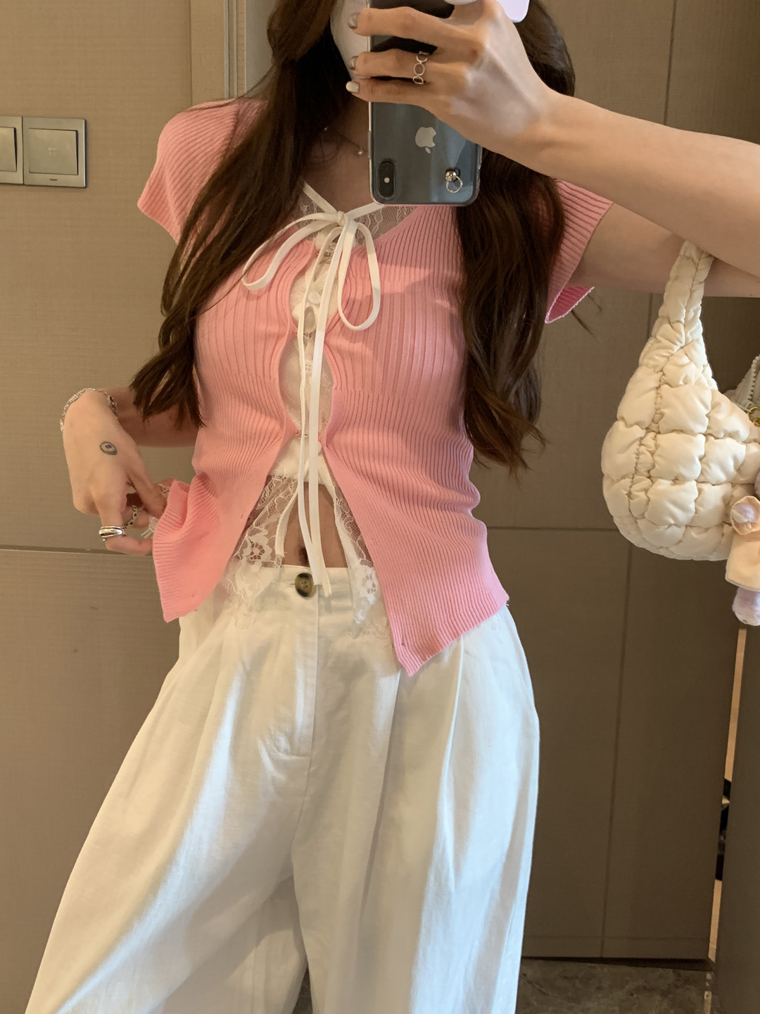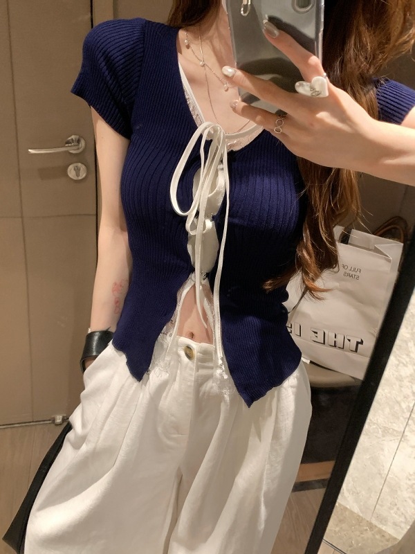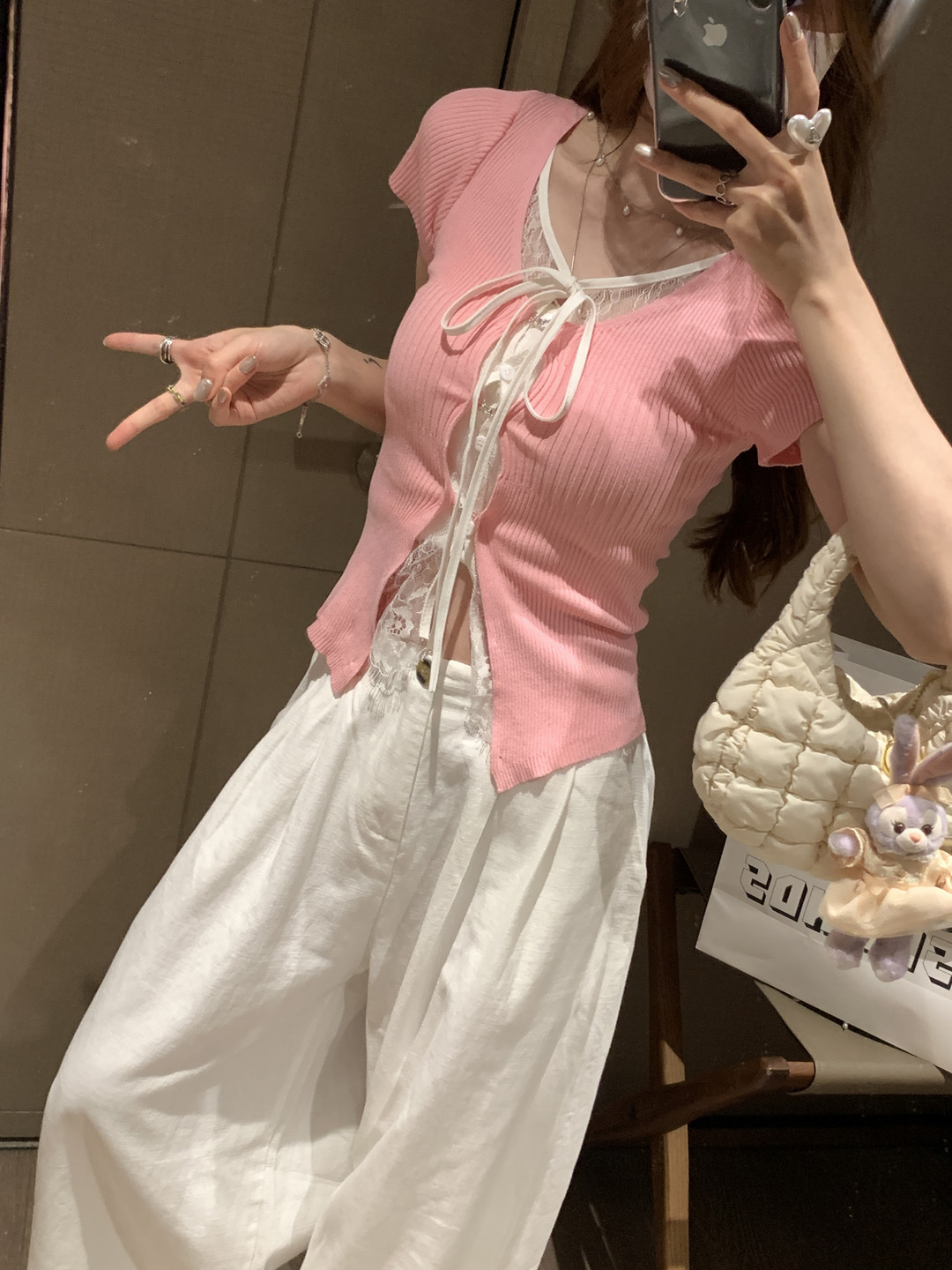 여성을위한 순수한 욕망 스타일 레이스 스플 라이스 레이스 업 반팔 스웨터 여름 새로운 섹시 할로우 가짜 투피스 오른쪽 어깨 탑