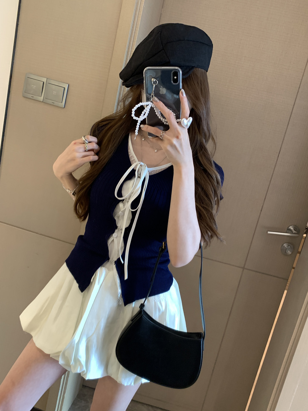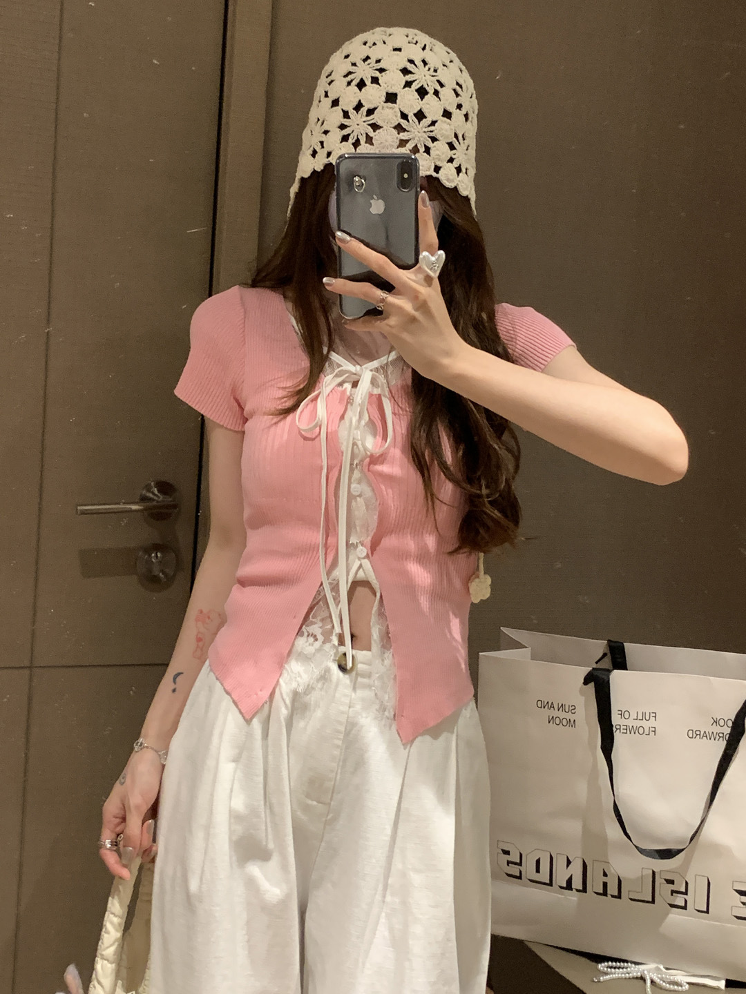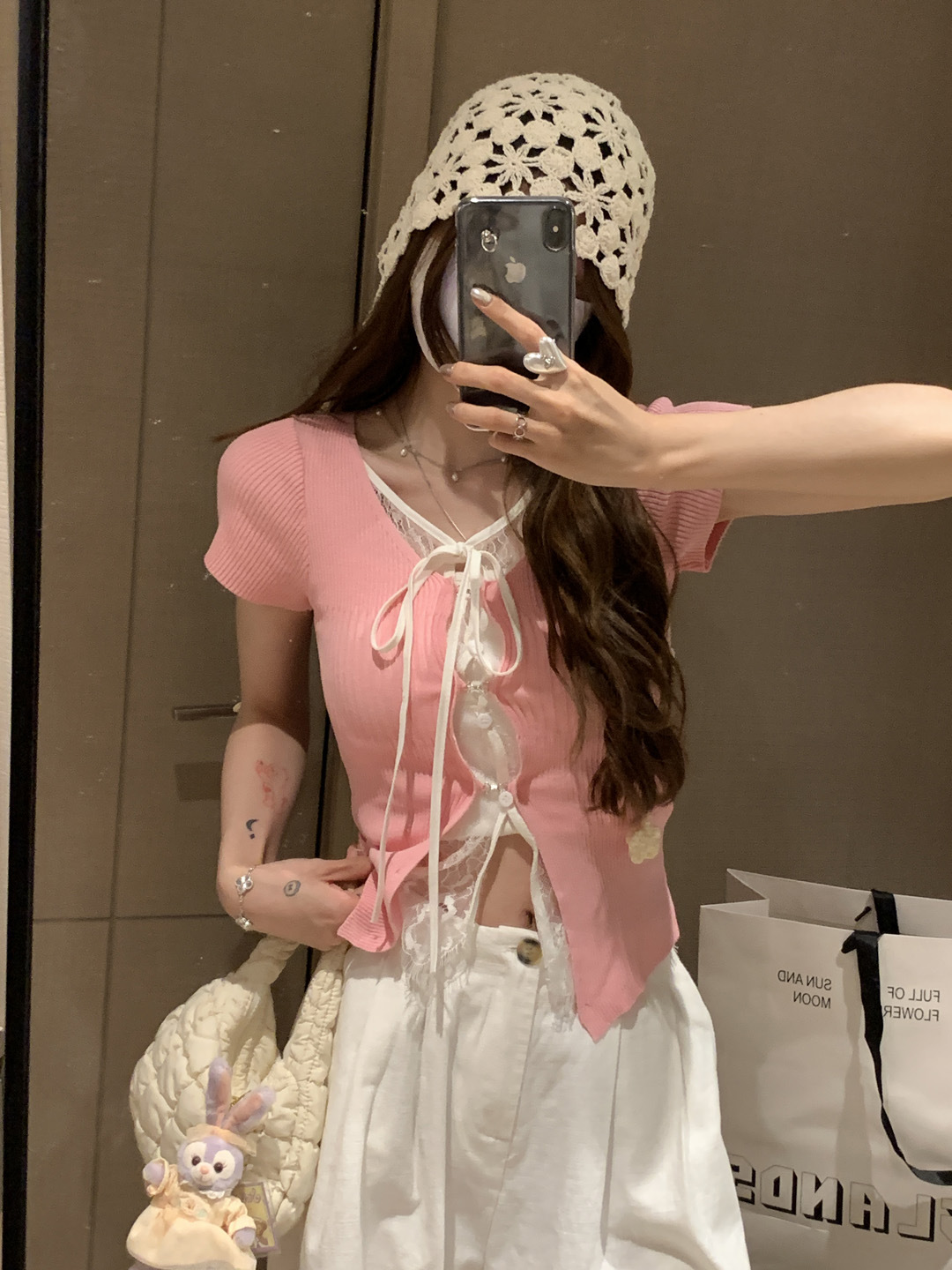 여성을위한 순수한 욕망 스타일 레이스 스플 라이스 레이스 업 반팔 스웨터 여름 새로운 섹시 할로우 가짜 투피스 오른쪽 어깨 탑