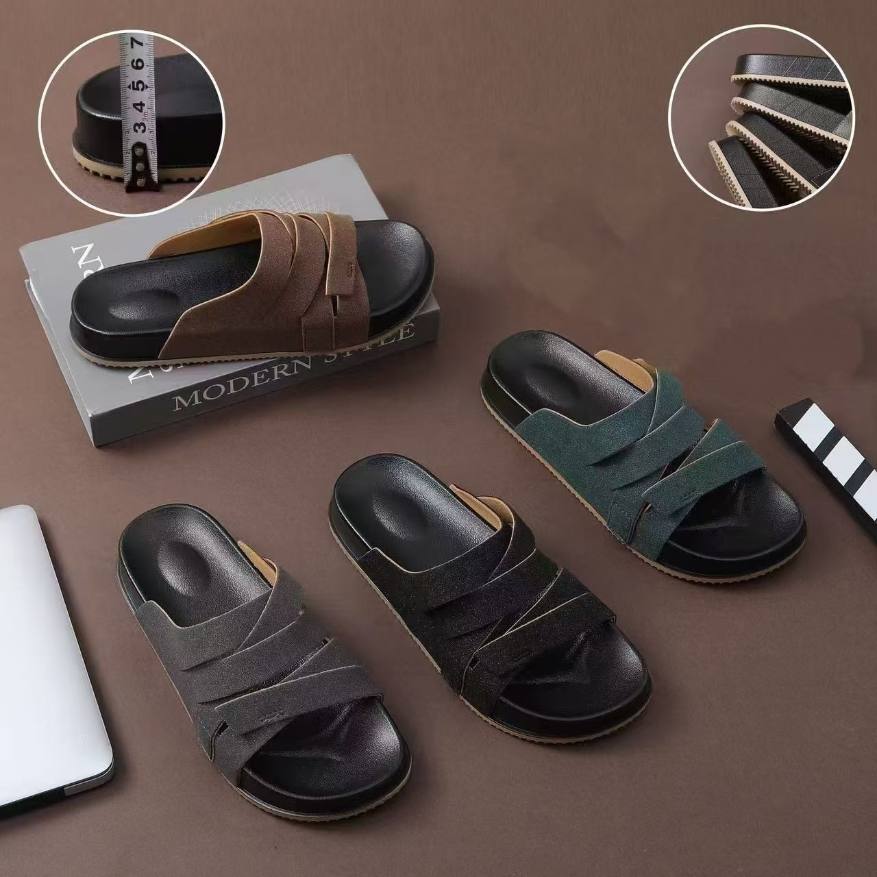 Dingbu 2025 새로운 여름 스타일 누벅 가죽 플래시 포인트 세련되고 다재다능한 크로스 소프트 솔 오픈 토우 캐주얼 남성 슬리퍼