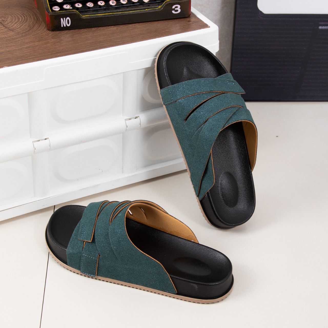 Dingbu 2025 새로운 여름 스타일 누벅 가죽 플래시 포인트 세련되고 다재다능한 크로스 소프트 솔 오픈 토우 캐주얼 남성 슬리퍼스토어 가기