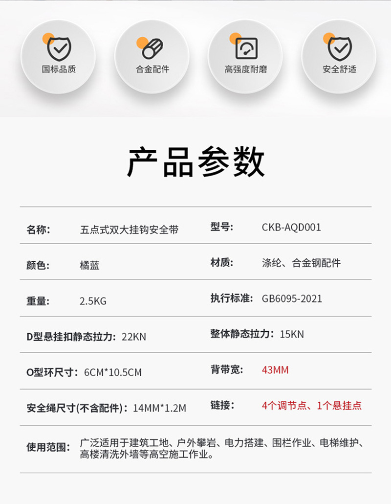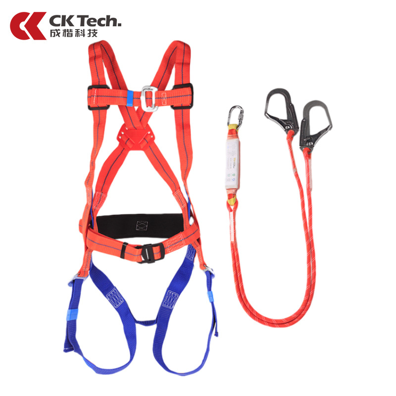 Chengkai Technology 국가 표준 5점 안전 벨트 고공 작업 이중 대형 후크 안전 로프 CKB-AQD001 오렌지 블루