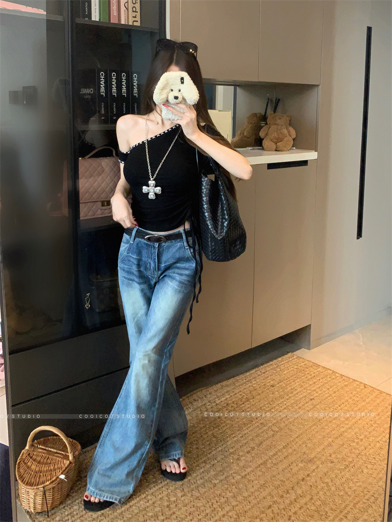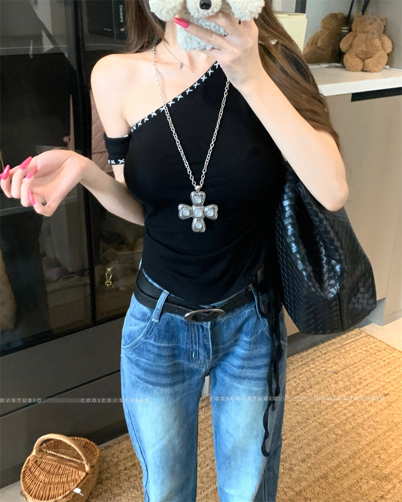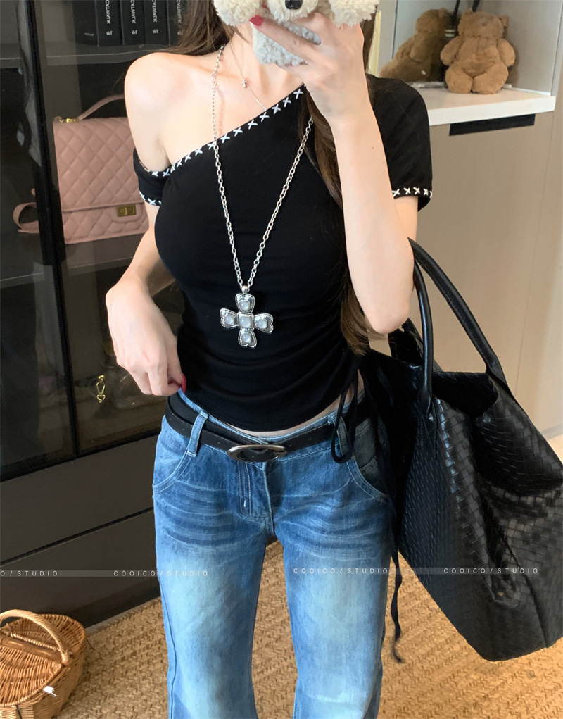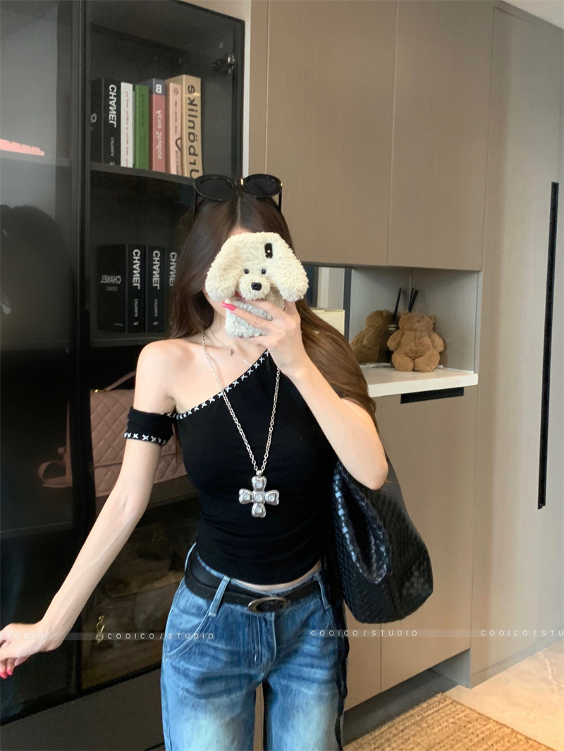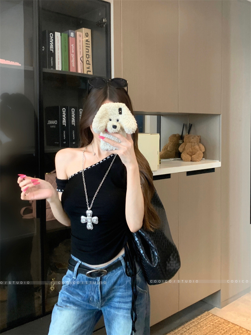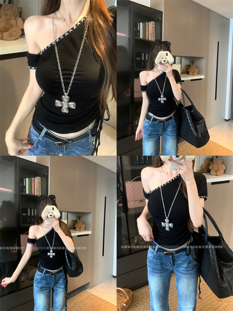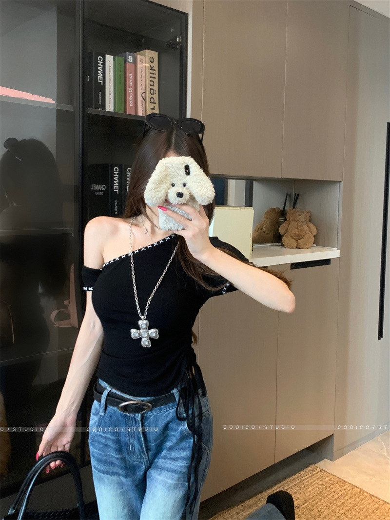 여름 디자인의 여성용 블랙 핫걸 오프숄더 반팔 티셔츠, 틈새 허리 조임끈 스트랩 숏 오프숄더 탑스토어 가기