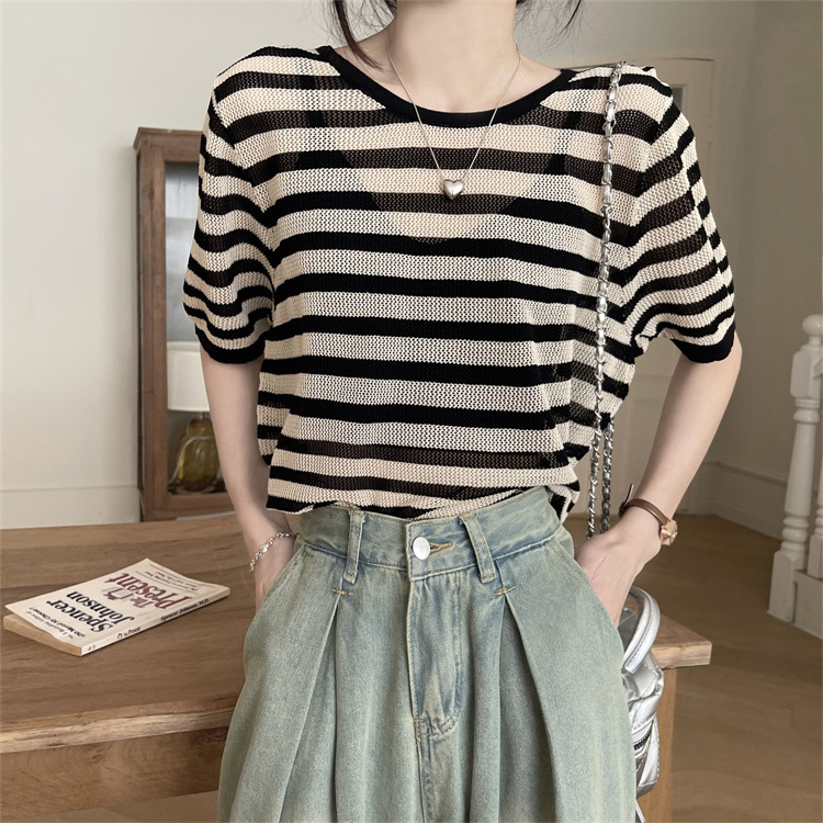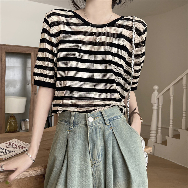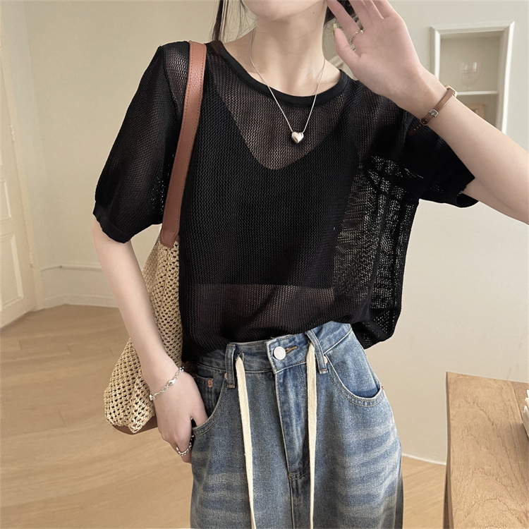 2025년 여름 새로운 스타일 중공 시크 슬림 티셔츠 반팔 여성 나이 감소 얇은 스웨터 짧은 탑