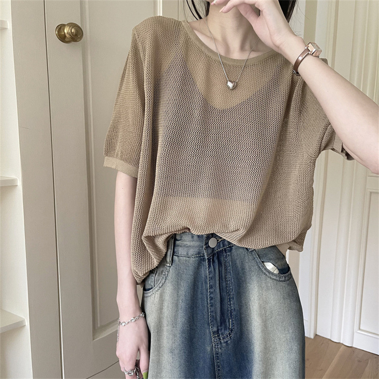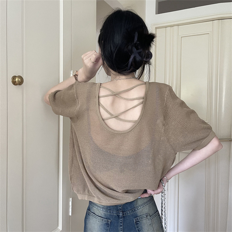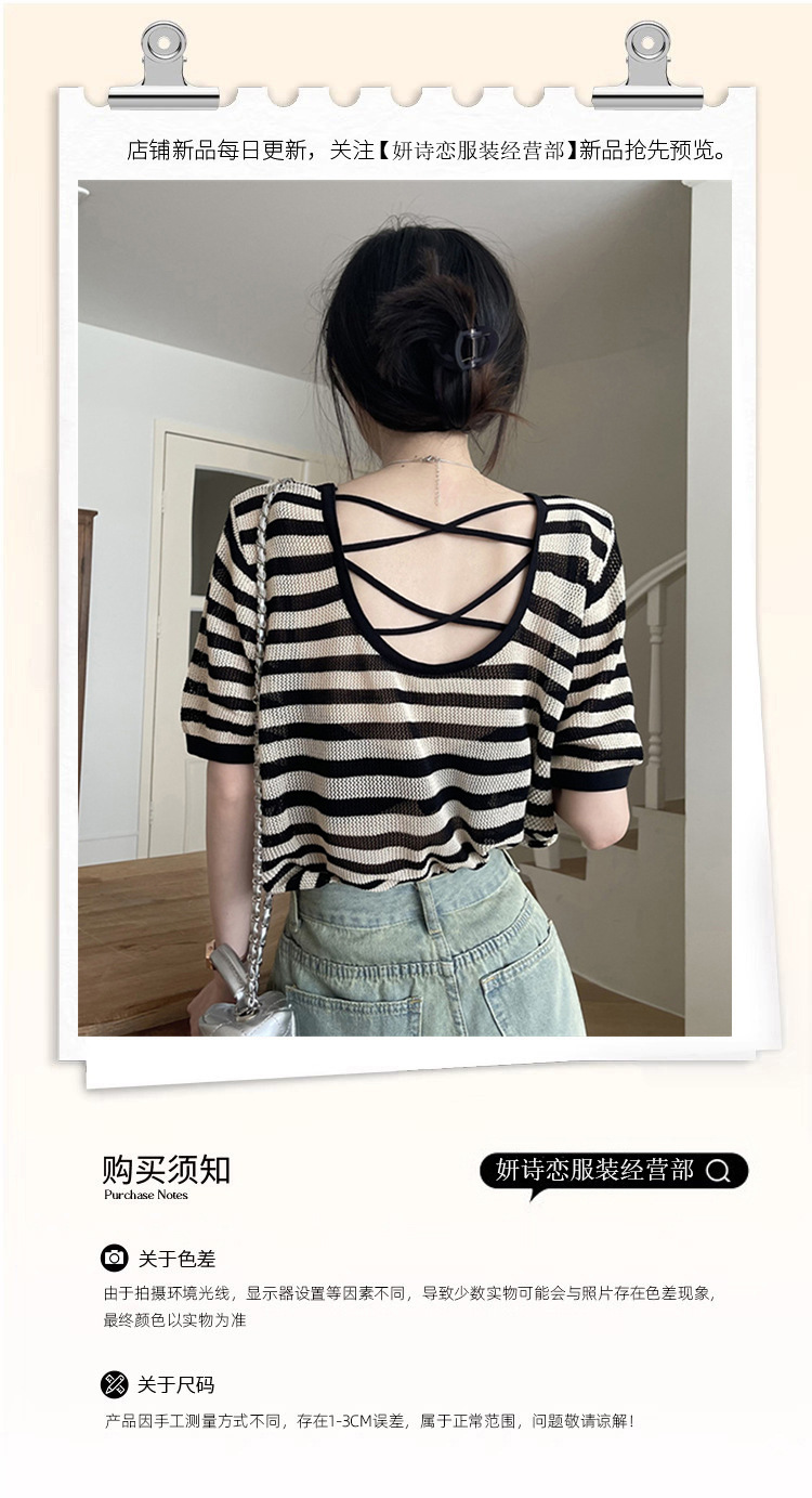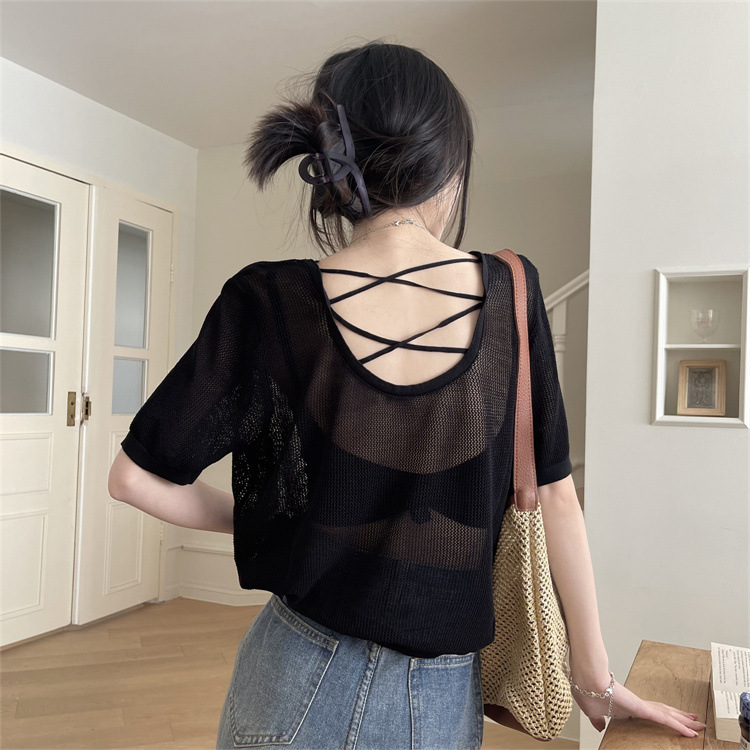 2025년 여름 새로운 스타일 중공 시크 슬림 티셔츠 반팔 여성 나이 감소 얇은 스웨터 짧은 탑스토어 가기