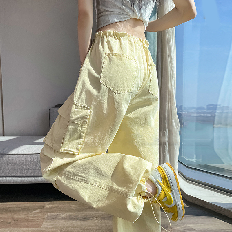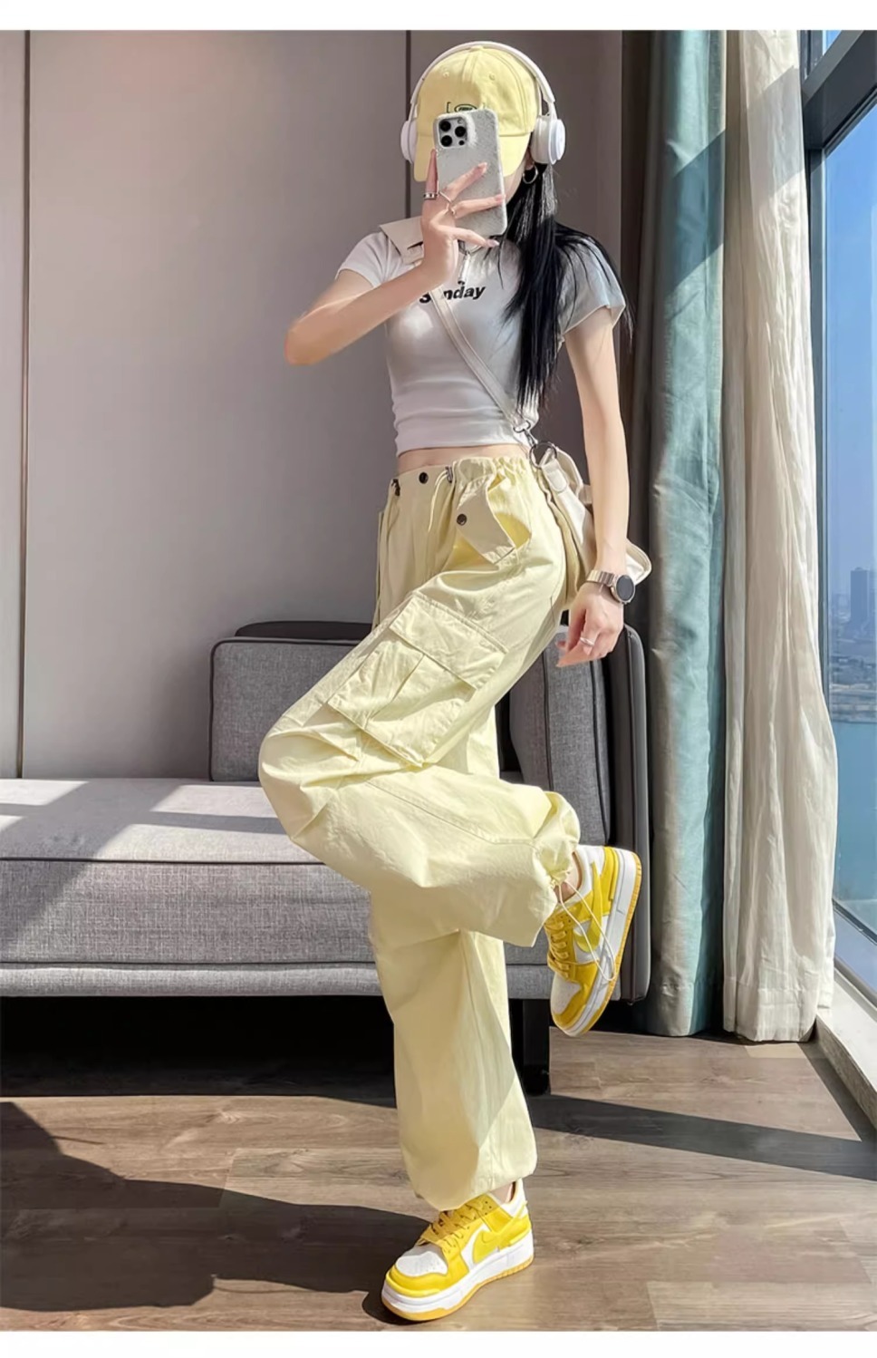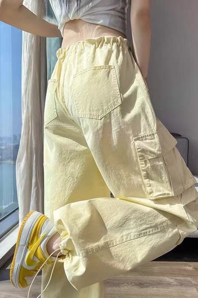 봄 여름 여성용 밀크 옐로우 아메리칸 레깅스 오버올, 키가 큰 사람들을 위한 유럽 스타일, 루즈하고 슬림한 와이드 레그 하이킹 팬츠스토어 가기