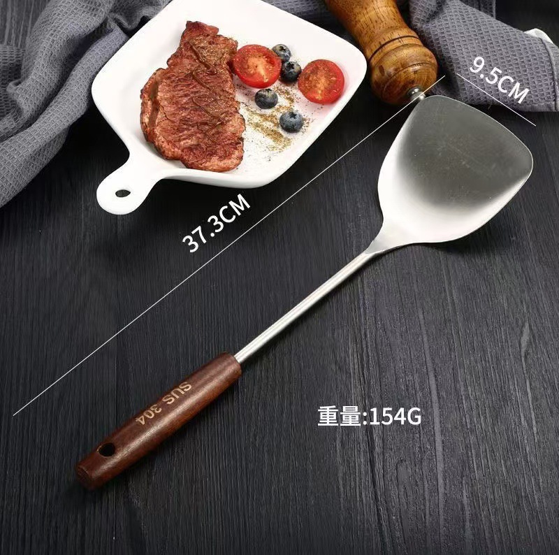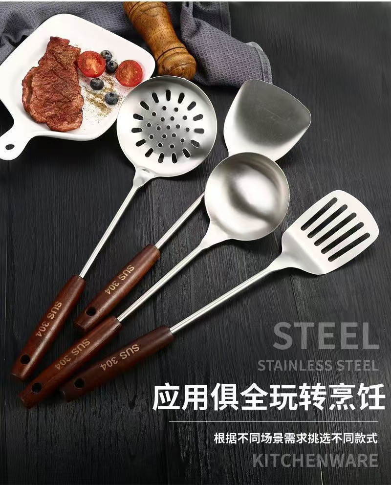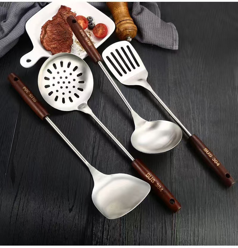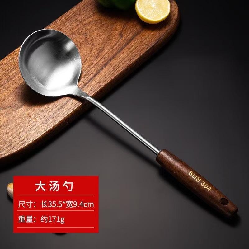 가정용 304 스테인레스 스틸 주걱 스푼 중국 주방 긴 손잡이 요리 주걱 나무 손잡이 화상 방지 요리 주방 용품 스푼