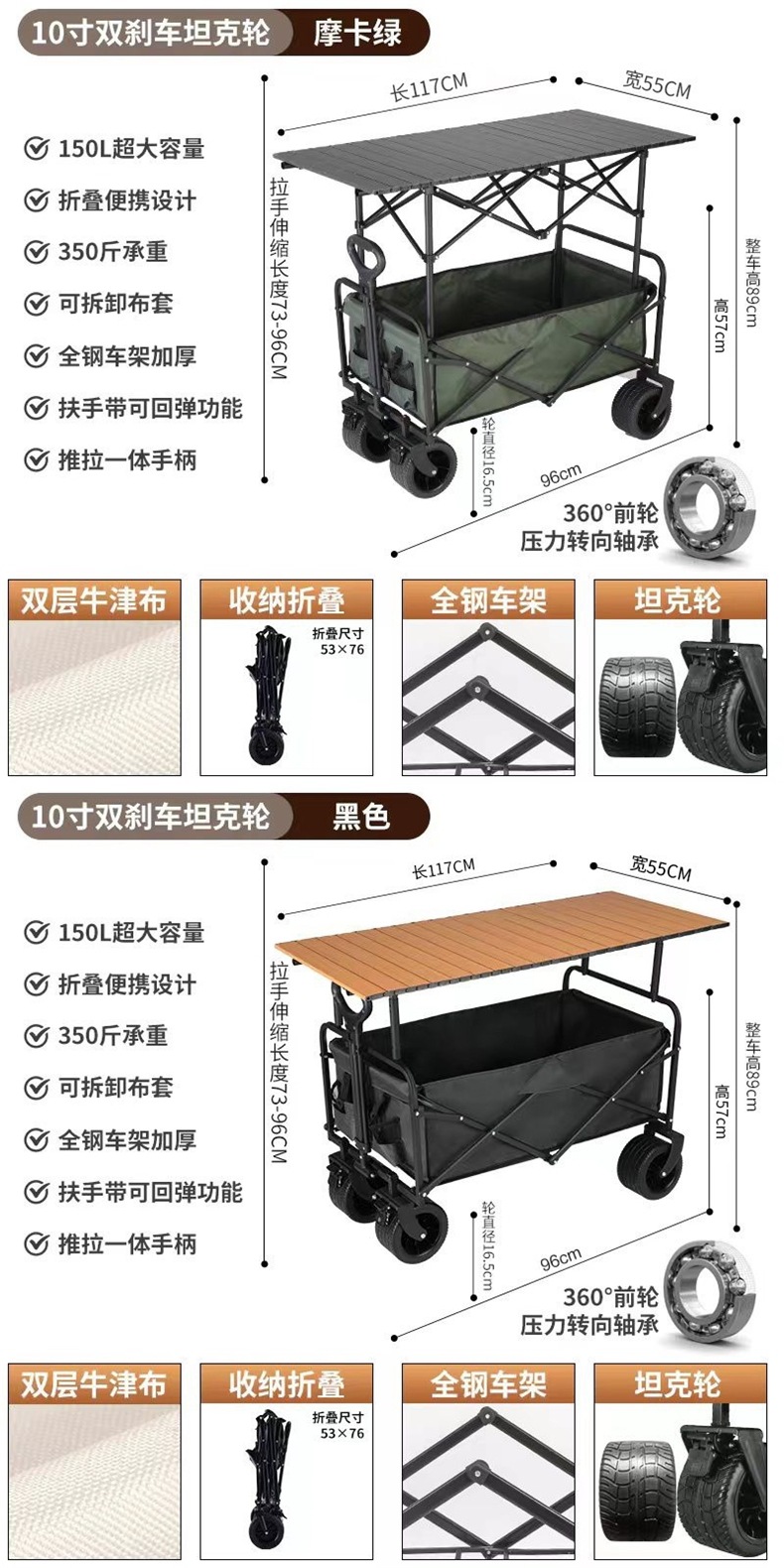 • 900D 더블 레이어 옥스포드 백 모카 그린 - 10inch 탱크 휠 카트 블랙 1.1m 테이블