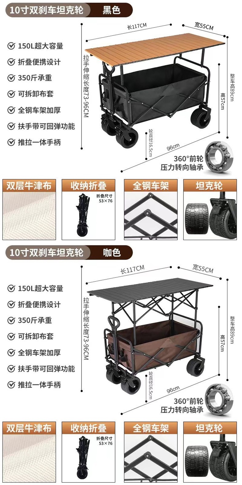 • 900D 더블 레이어 옥스포드 천 가방 커피 색상 - 10inch 탱크 휠 카트 블랙 1.1m 테이블