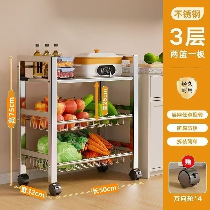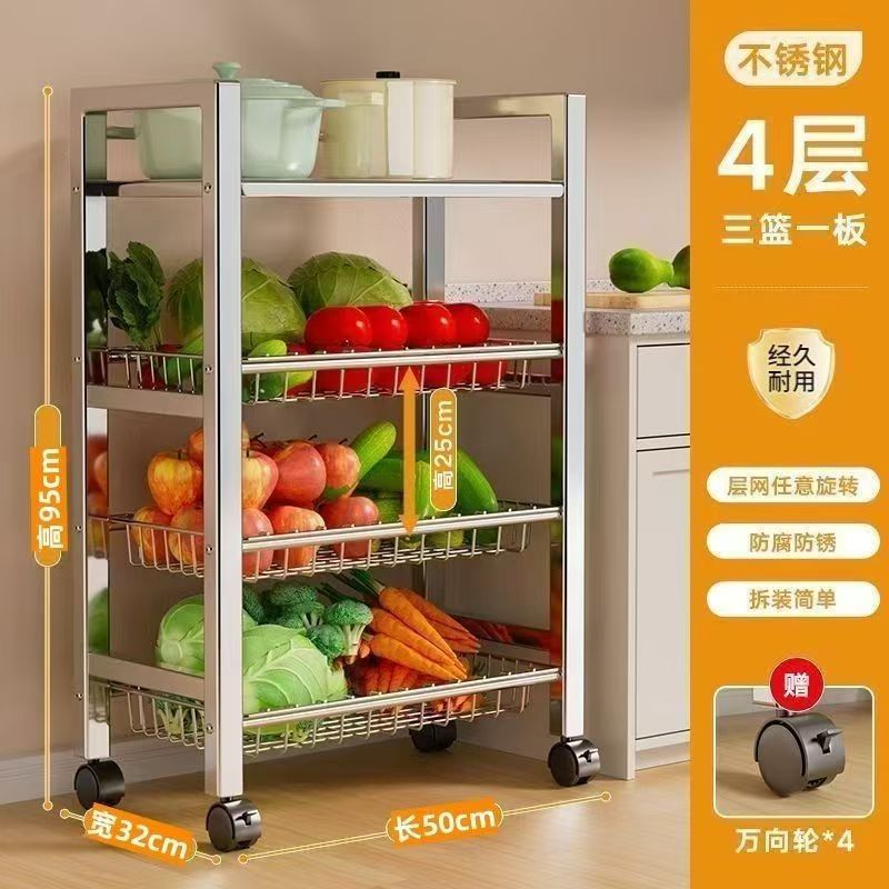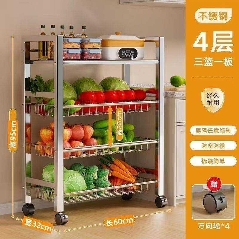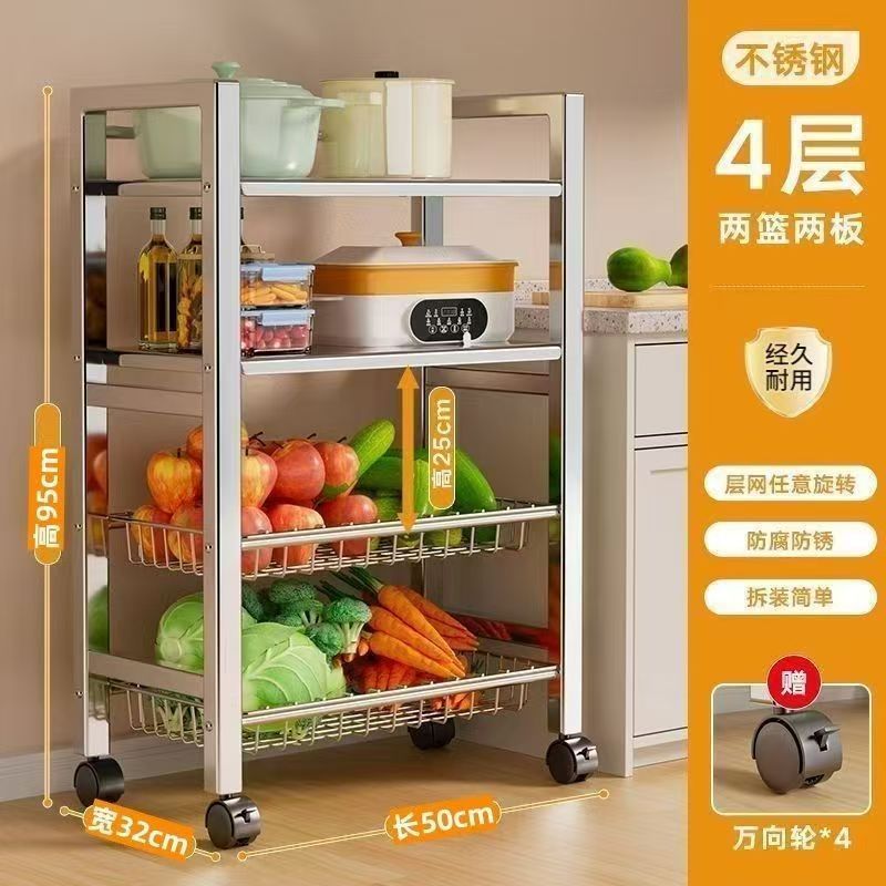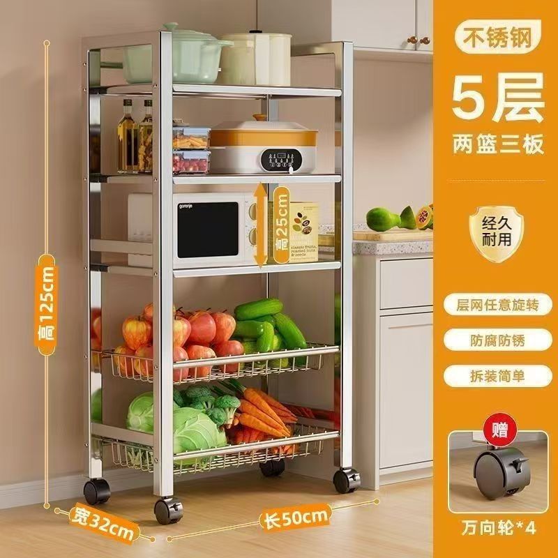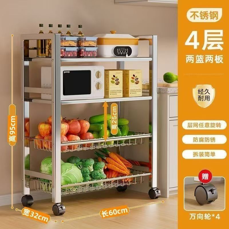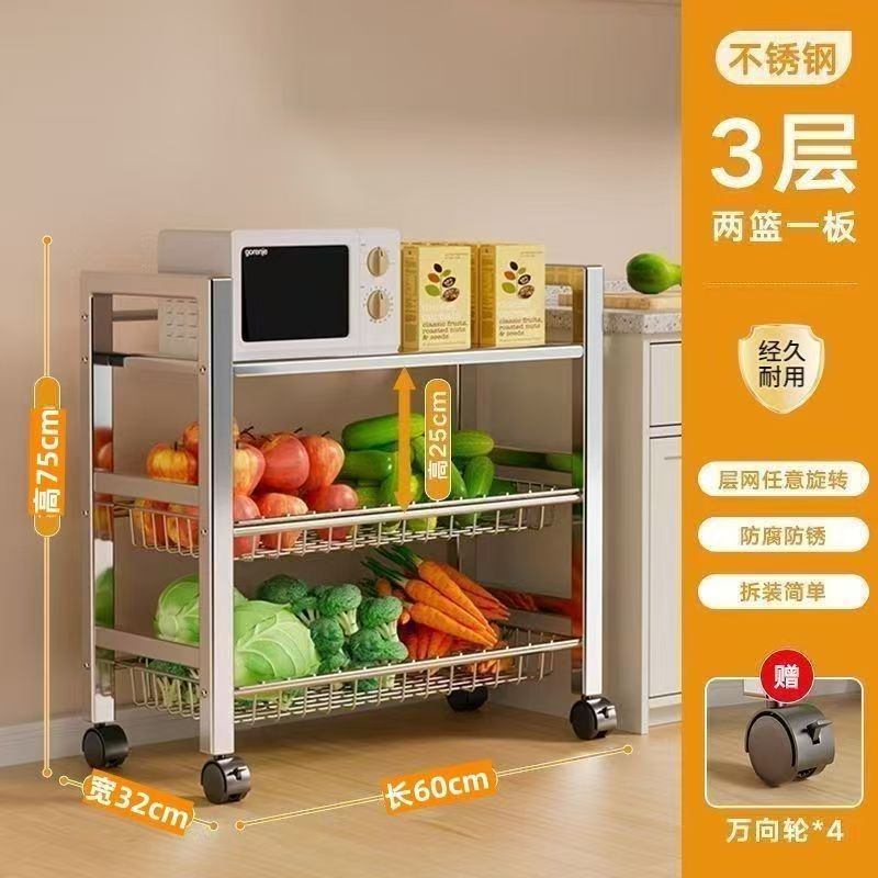 두꺼운 스테인레스 스틸 주방 야채 바구니 보관 랙 바닥에 놓인 다층 전자 레인지 보관 랙 냄비 다기능 랙