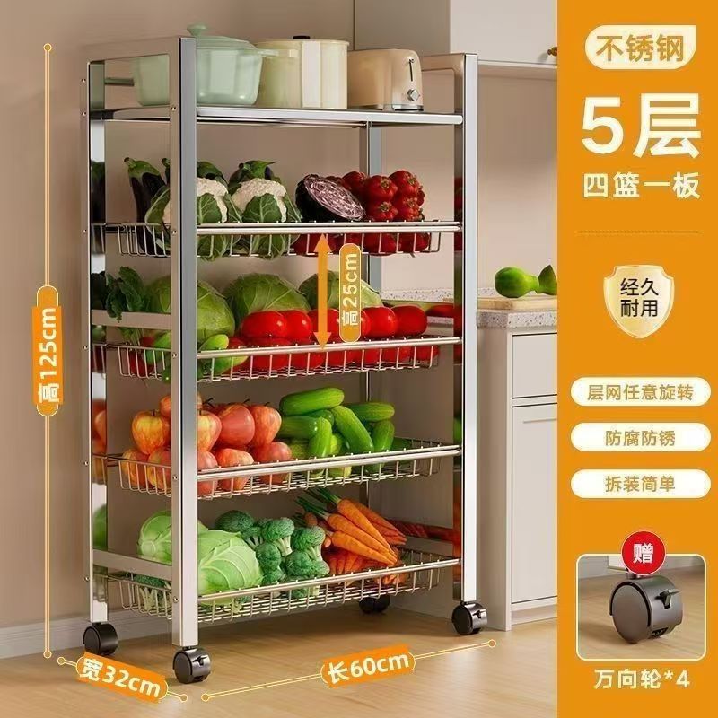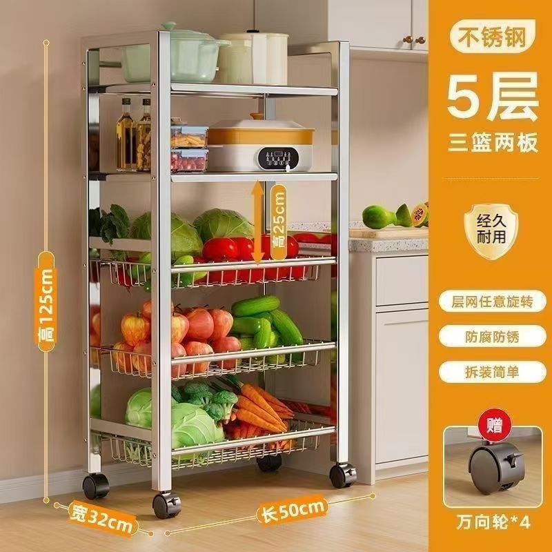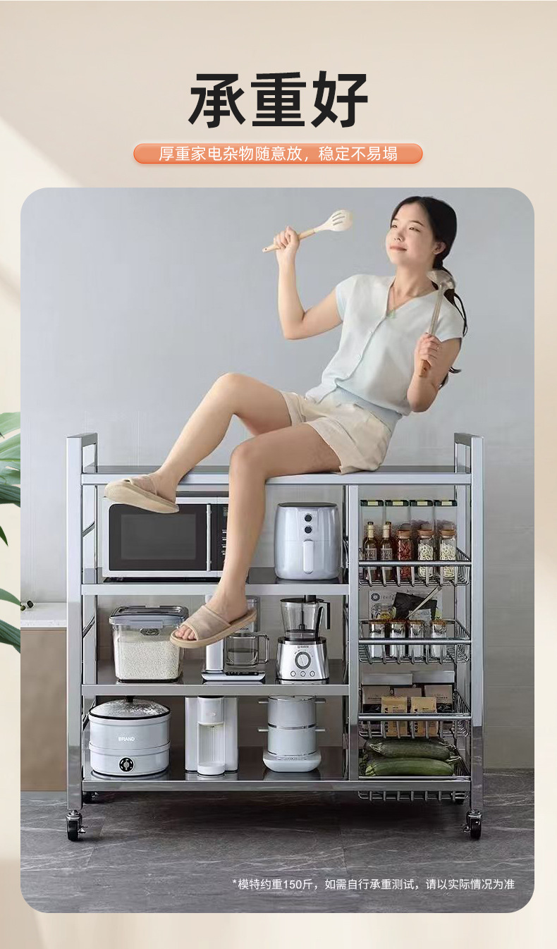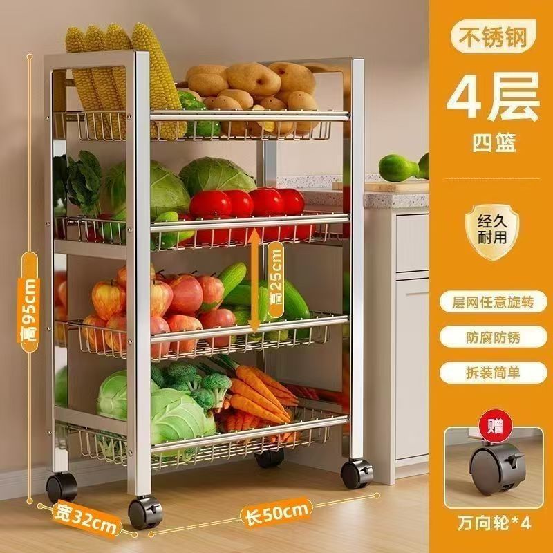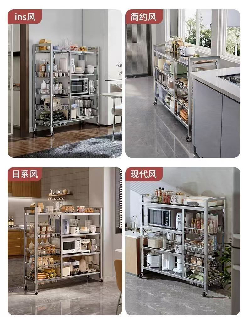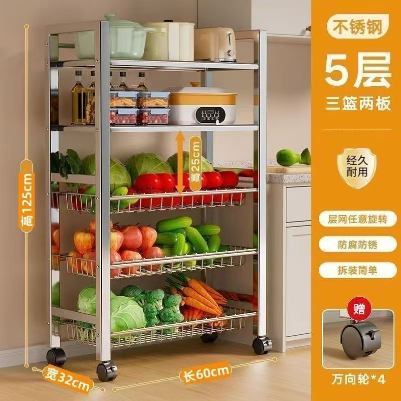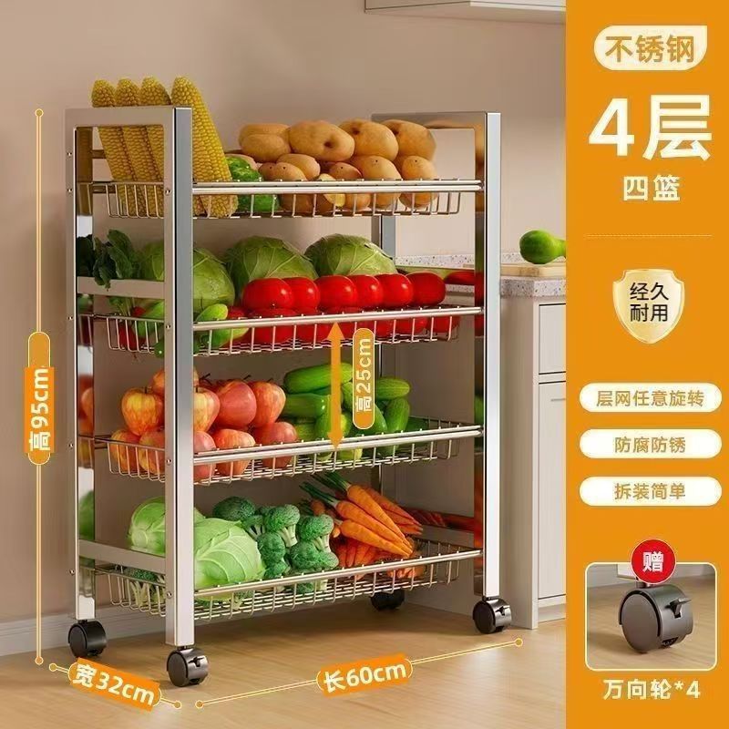 두꺼운 스테인레스 스틸 주방 야채 바구니 보관 랙 바닥에 놓인 다층 전자 레인지 보관 랙 냄비 다기능 랙