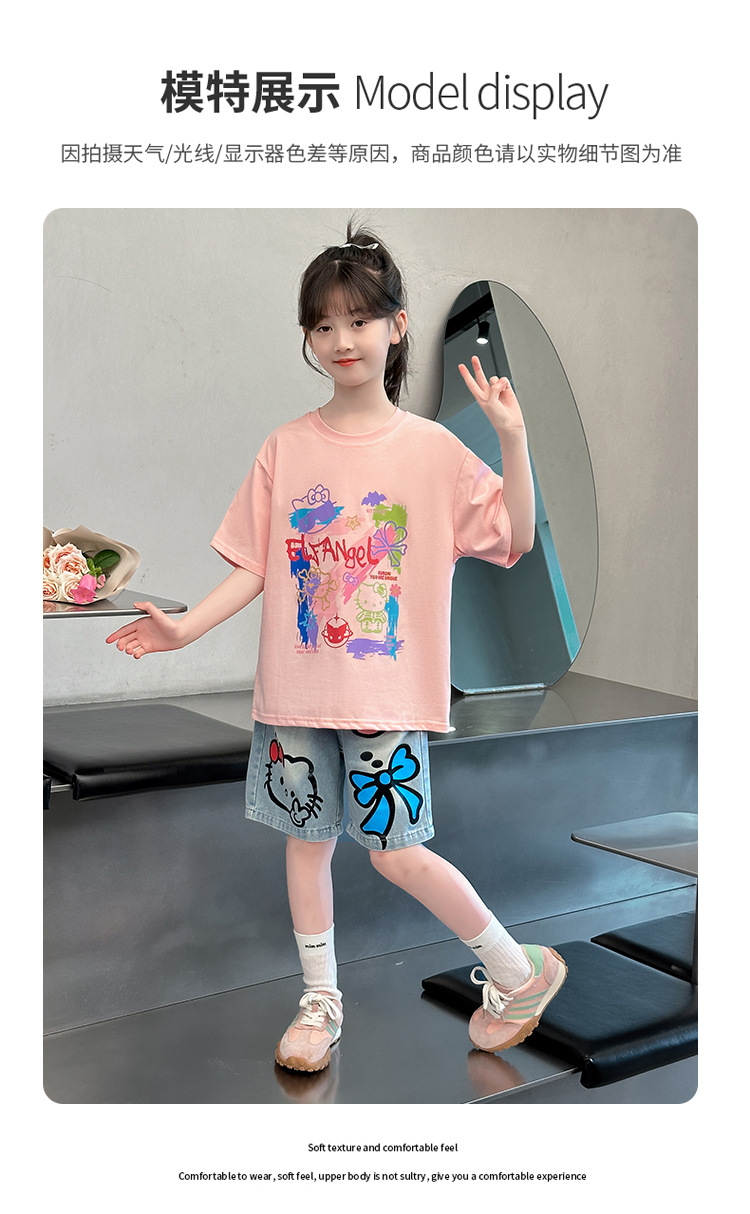 여자 여름 정장 2025 새로운 유행 여자 유행 거리 반팔 어린이 만화 청바지 투피스 세트스토어 가기