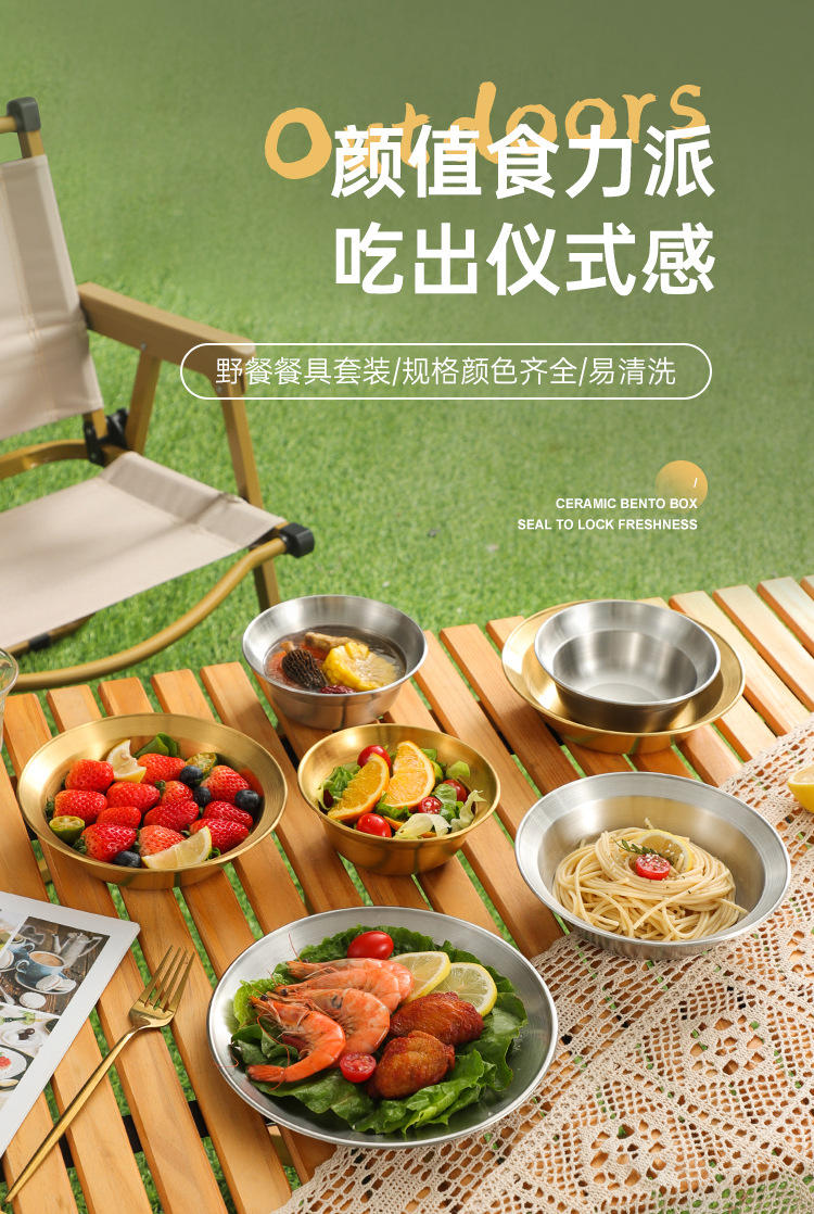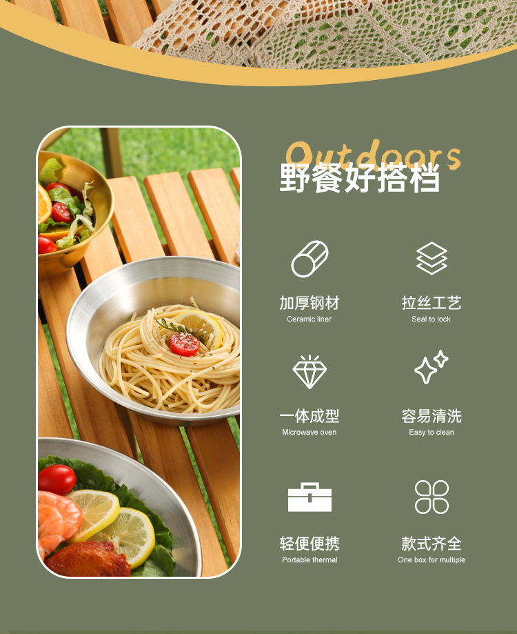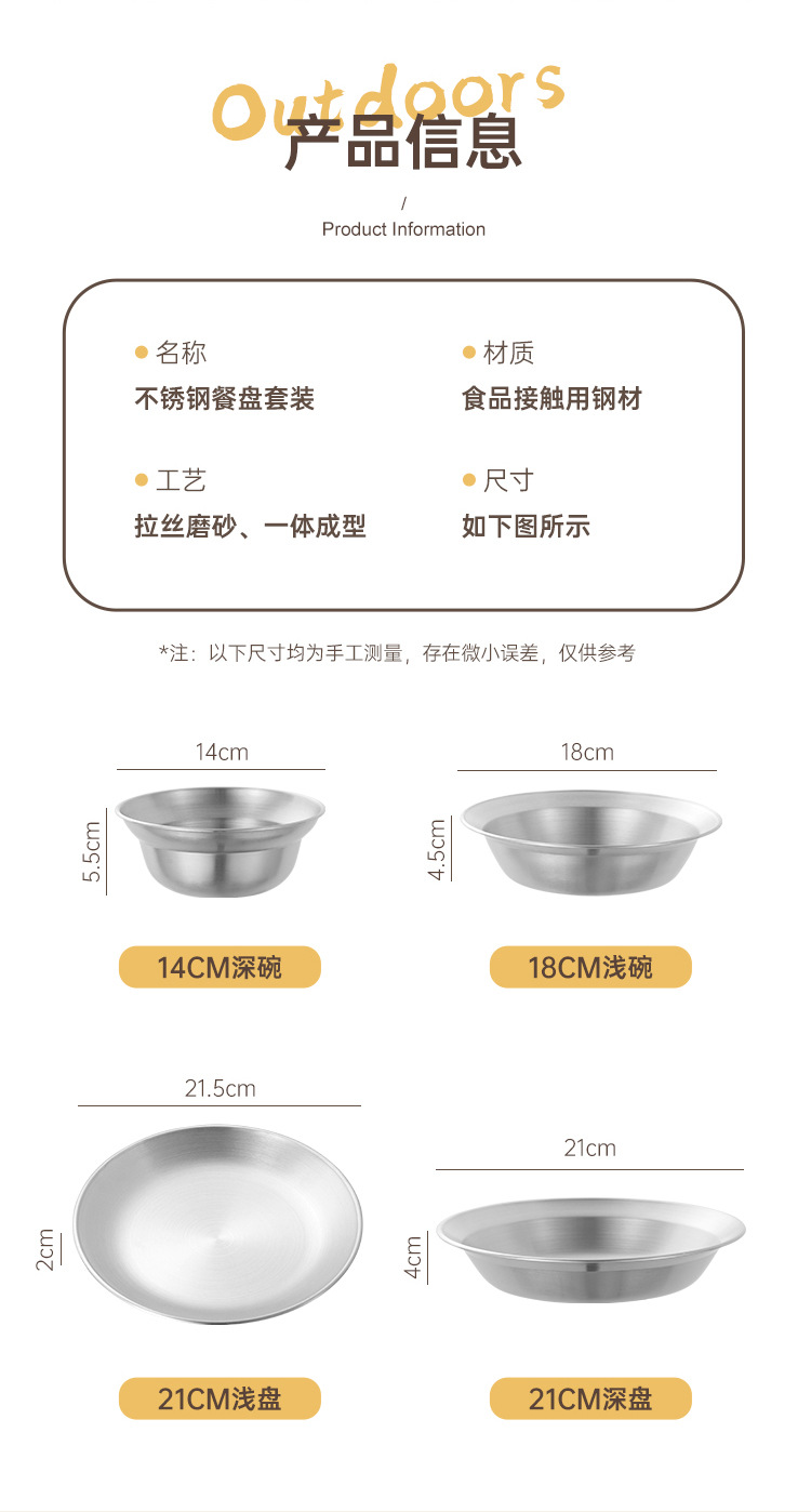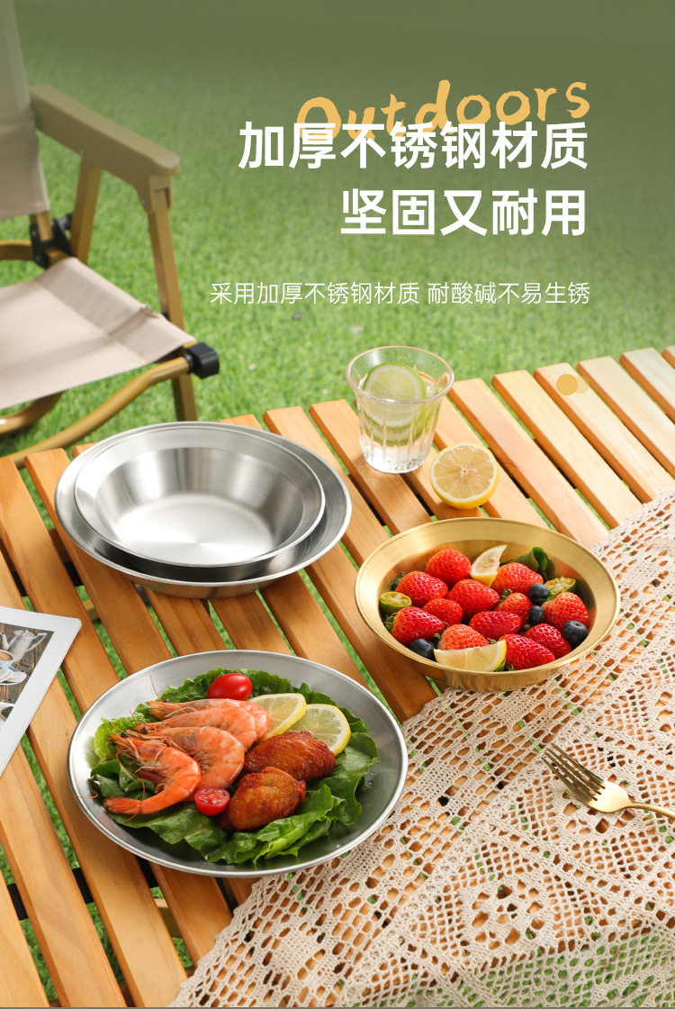 국경 간 스테인레스 스틸 야외 피크닉 휴대용 식기 4 피스 서빙 플레이트 캠핑 피크닉 장비 라운드 스낵 플레이트