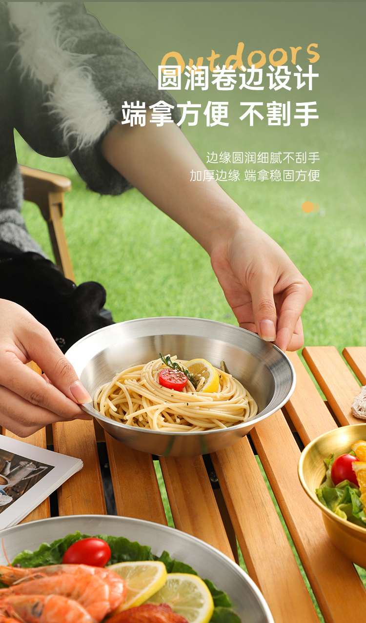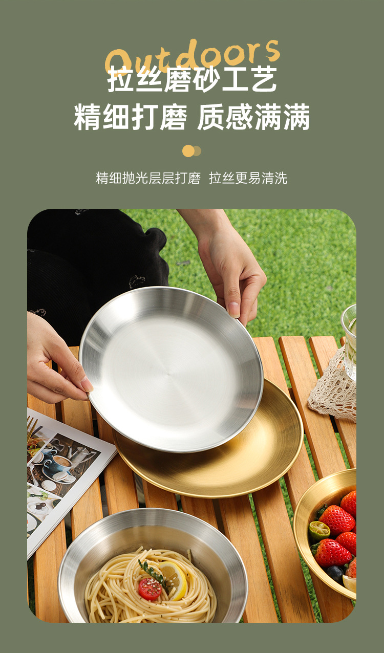 국경 간 스테인레스 스틸 야외 피크닉 휴대용 식기 4 피스 서빙 플레이트 캠핑 피크닉 장비 라운드 스낵 플레이트스토어 가기