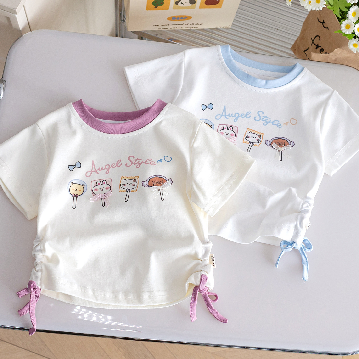 어린이 다목적 반팔 티셔츠 2025 새로운 스타일 아기 소녀 반팔 만화 졸라매는 끈 인쇄 서양식 탑 셔츠