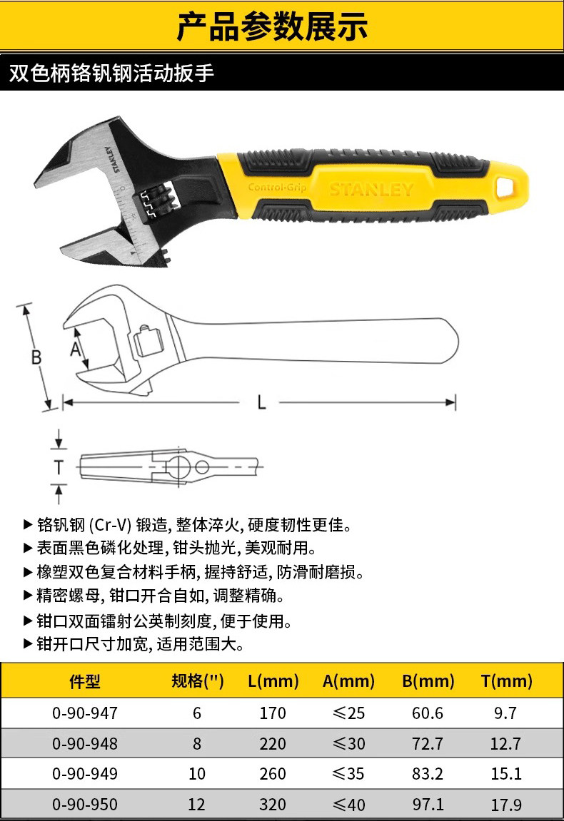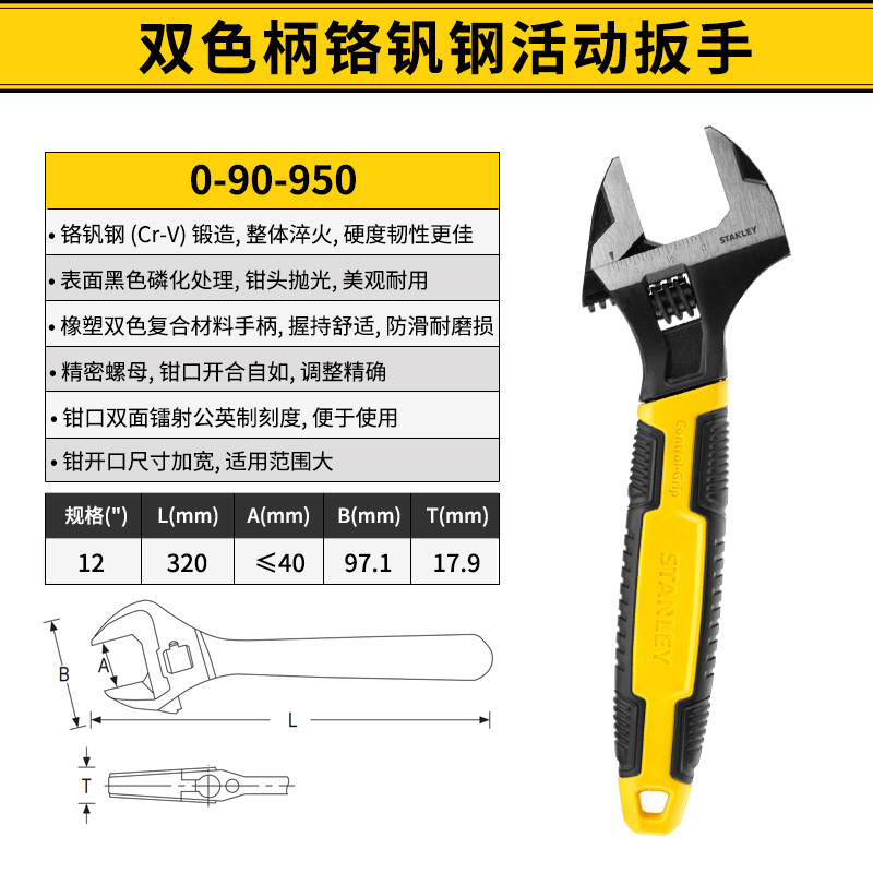 스탠리 2색 핸들 크롬 바나듐 강철 조절식 렌치 6inch / 8inch / 10inch / 12inch 가정용 범용 렌치