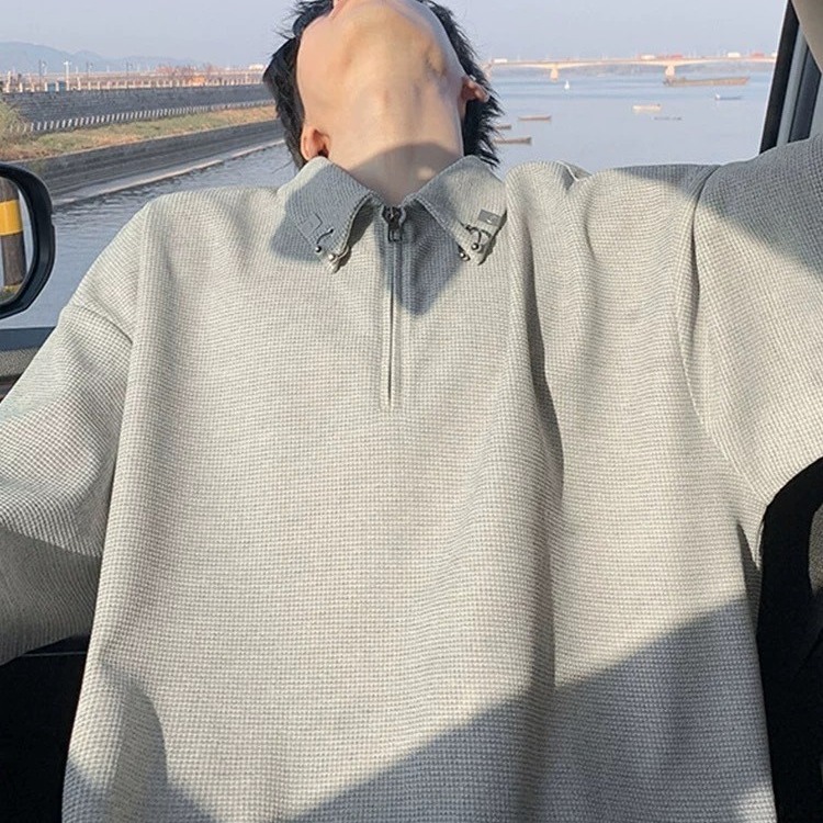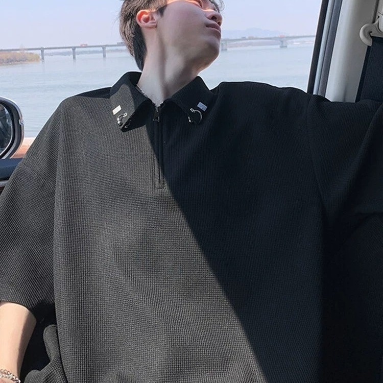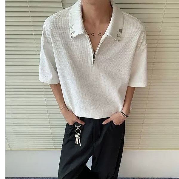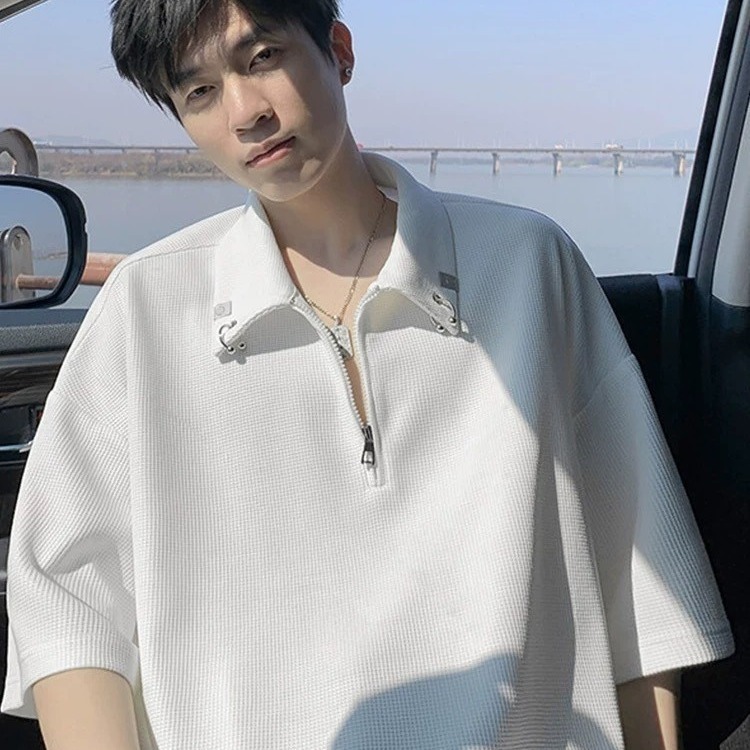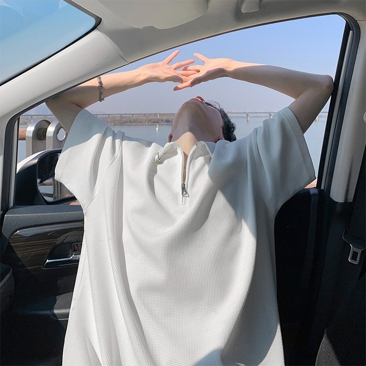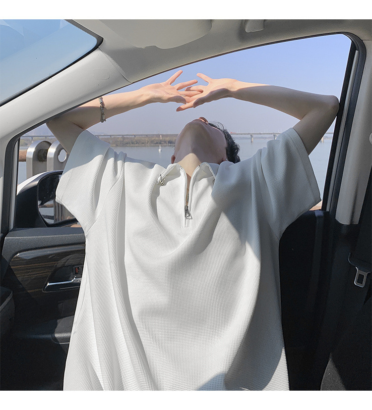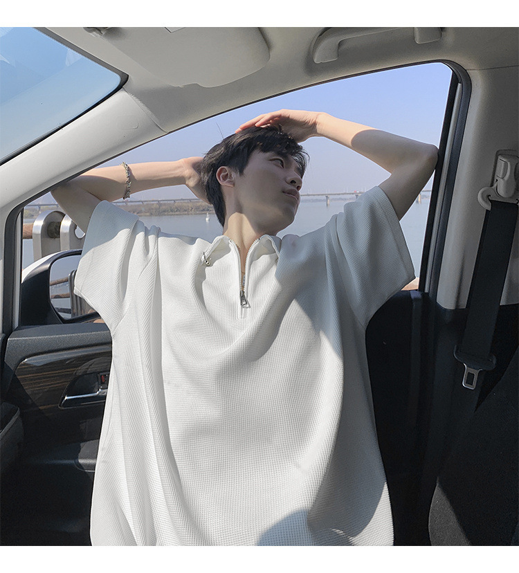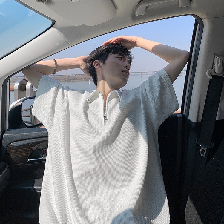 하프 지퍼 와플 반팔 폴로 셔츠 남성 여름 트렌디 아메리칸 의류 루즈 트렌디 헤비 반팔 티셔츠스토어 가기