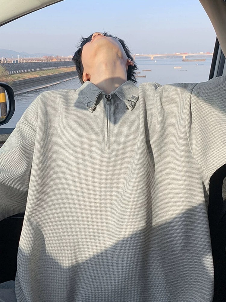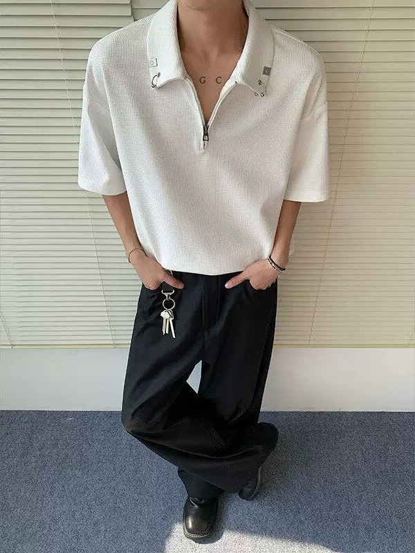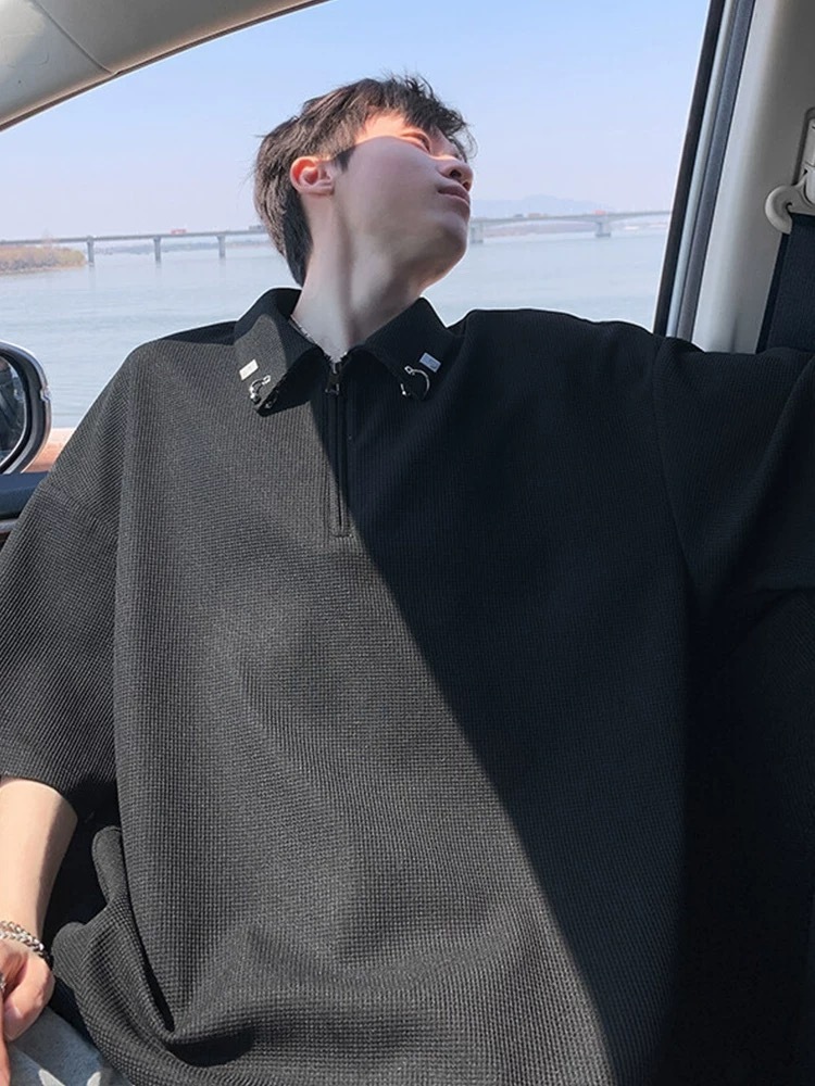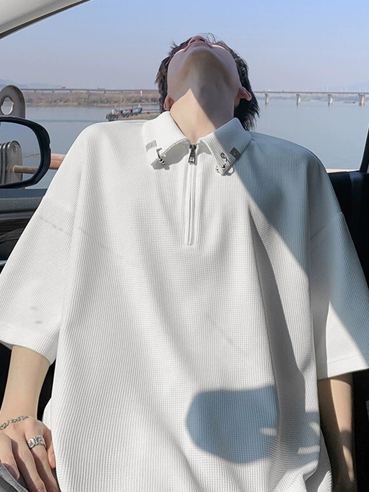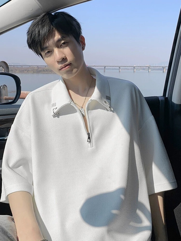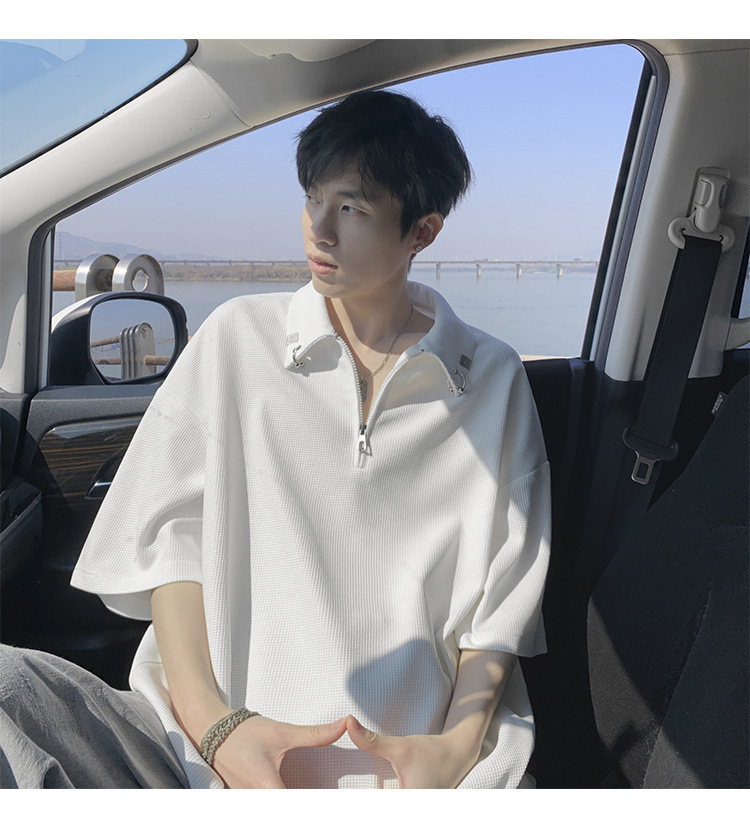 하프 지퍼 와플 반팔 폴로 셔츠 남성 여름 트렌디 아메리칸 의류 루즈 트렌디 헤비 반팔 티셔츠