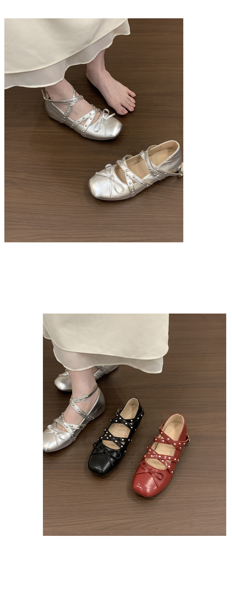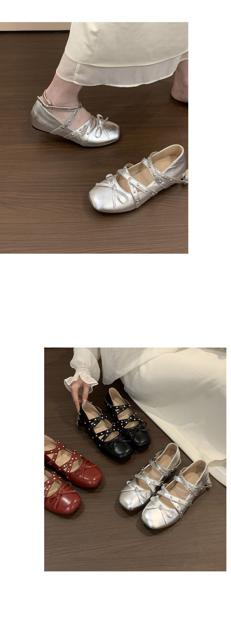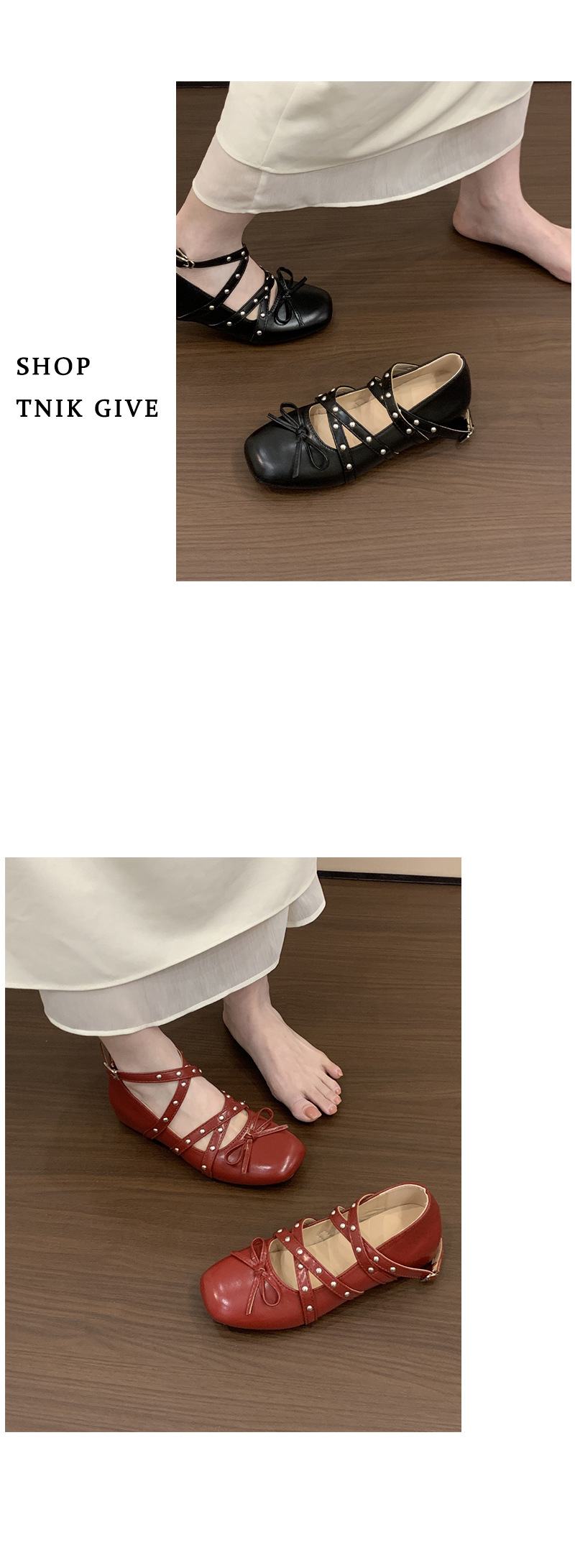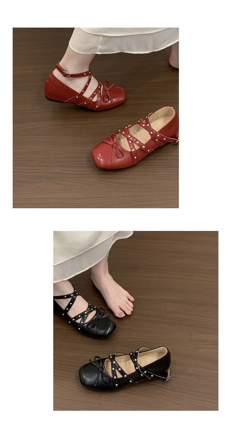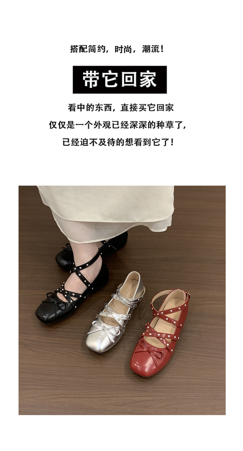 여성을위한 레드 크로스 스트랩 보우 작은 신발 2025 봄 새로운 복고풍 펌프 리벳 발레 플랫