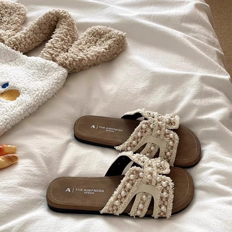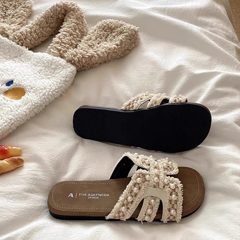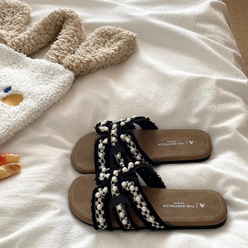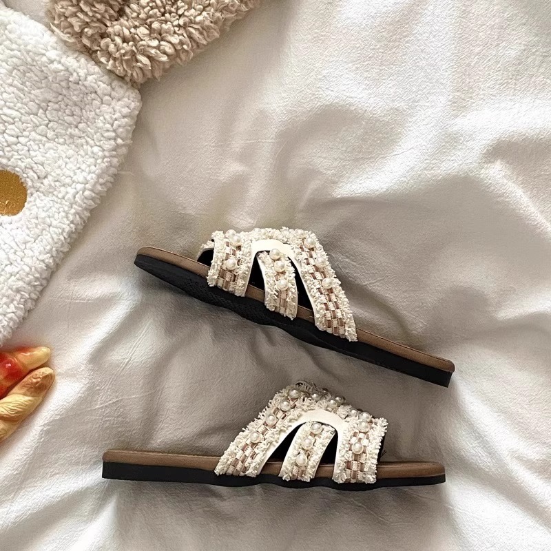 여성을위한 슈퍼 부드러운 부드러운 가죽 진주 짠 복고풍 유행 샌들 여름 새로운 겉옷 프랑스 스타일 부드러운 스타일 틈새 플랫 슬리퍼스토어 가기