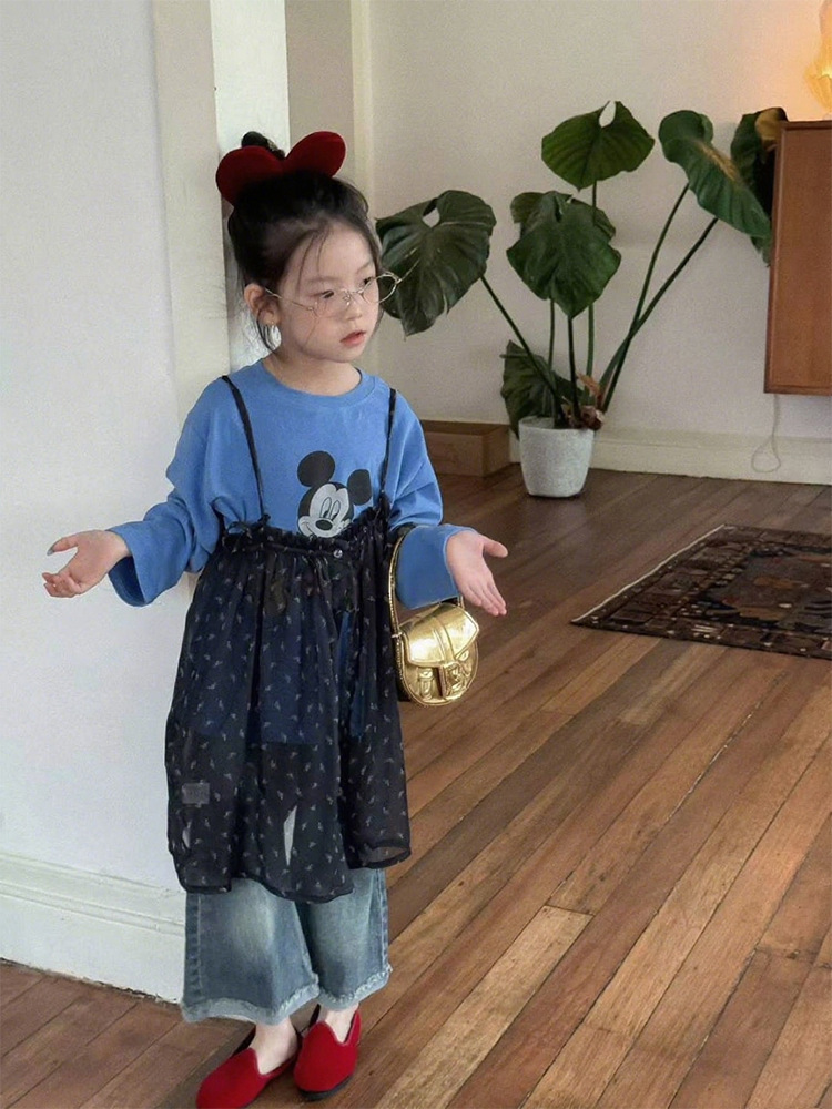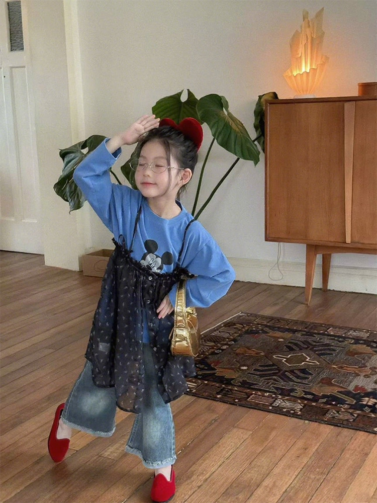 여자 한국 스타일 가을 새로운 만화 탑 서스펜더 메쉬 스커트 2025 레이스 마이크로 플레어 청바지 투피스 트렌디 세트